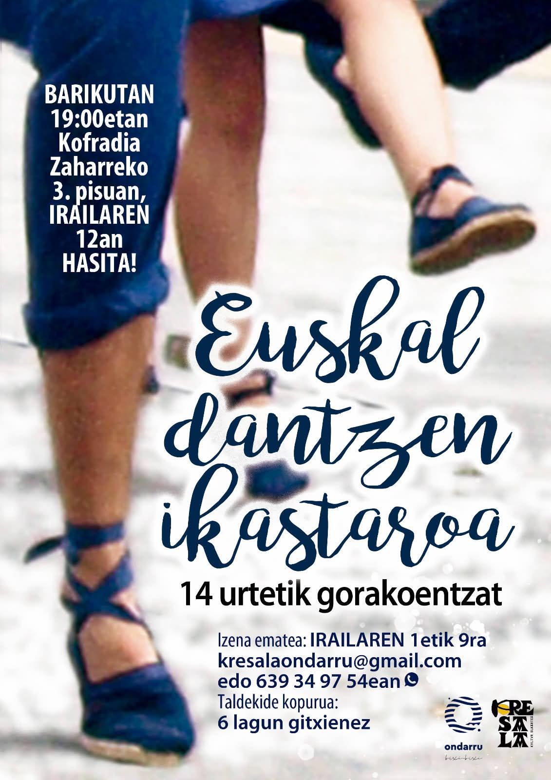 Zenbat bidar geatu gaz gogukin bai Zapato Azulin bai Arrantzale egunin antolatzen dizen Euskal Erromexetan dantzan etxeko? Ba hamen dakazu aukeri zeube egun horretan bestin artin eoteko.14 urtetik gorakuntzako Euskal DANTZA ikastaru antolatu dau KRESALA kultur elkartik. Ixenak emoteko epi, Irailak 1etik 9 bittartin behian agertzen dan korreo postan. Baixakutan ixango diz Entsaxuk ta Irailan 12xan hasiko diz, tokixe, Kofrai Zaharreko 3.solairun. Anima ta hartu parte!
