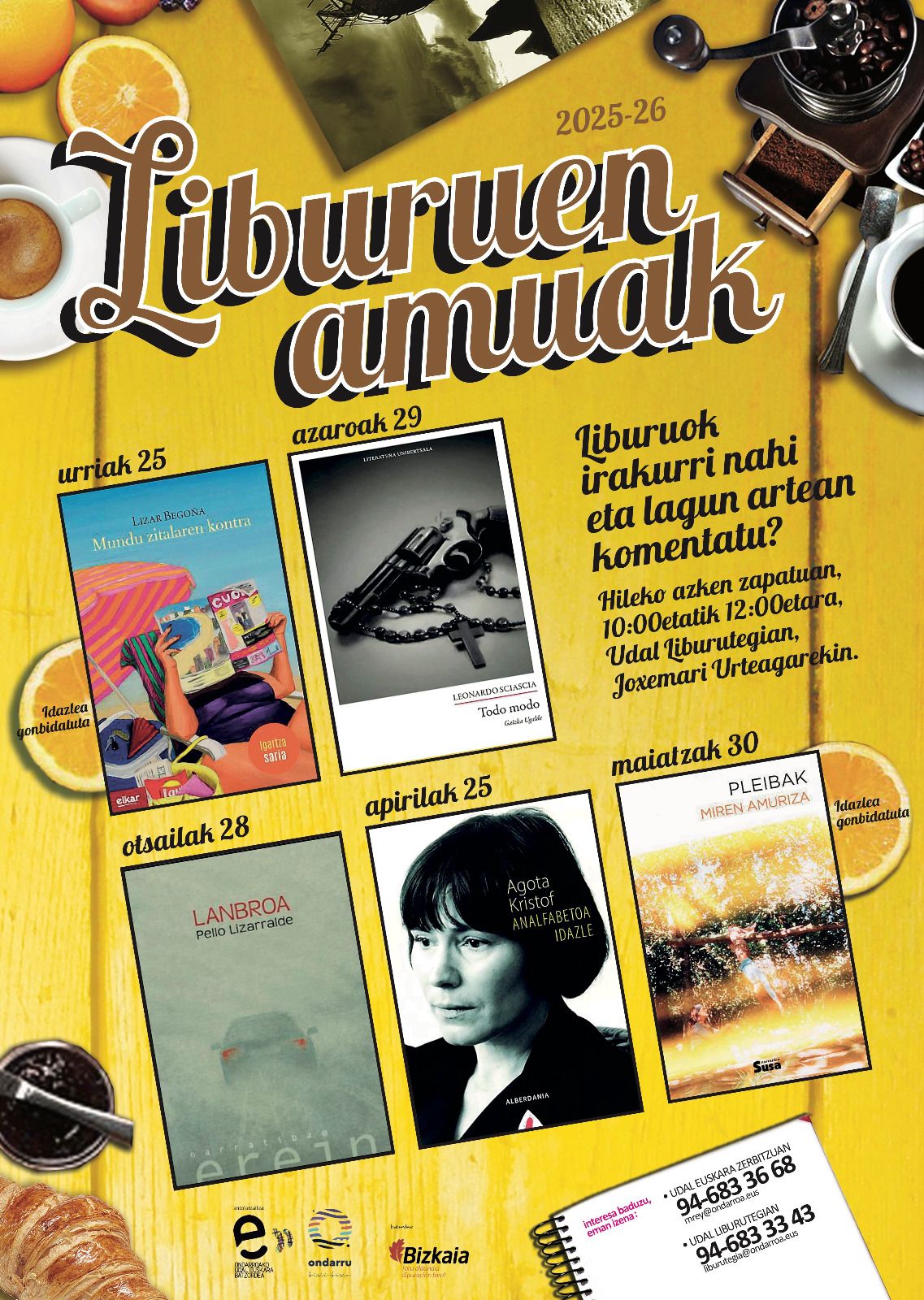 Gustoku badozu liburuk irakurti eta gero lagun artin alkarreaz komentati zer eritzi gatzun, ezin zeinke galdu aukera hau. Bost liburu, bost idazle, bost editorial, bost hilleko azkan zapatutan batuko diz udal liburutegixan, JOXEMARI URTEAGAN gidaritzapin. Liburu irakurti plazerra dalako, etorri ta hartu parte!
