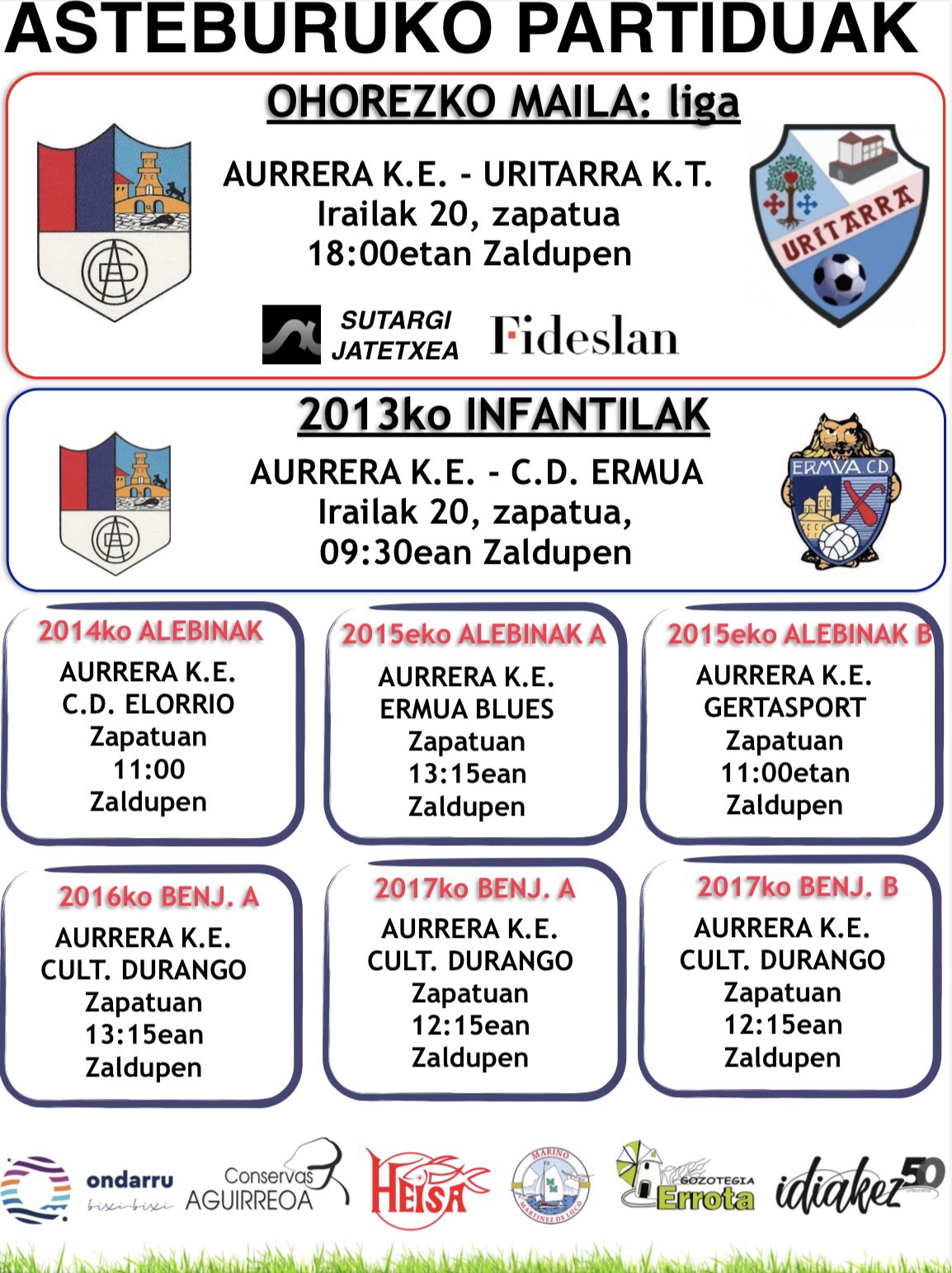 Azpixan ikusiko dozuenak diz AURRERAko talde desbardiñak ongo astebukaeran Zaldupe udal futbol zelaxan jokatukotxuen partidun egun eta ordutegixak.