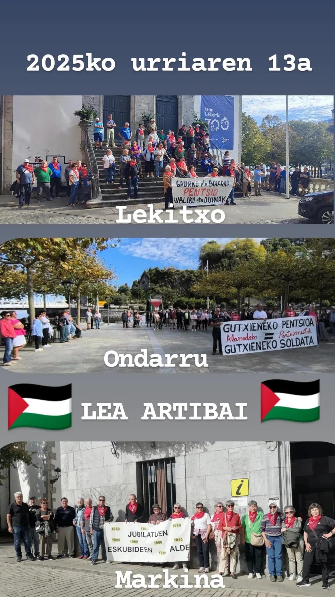 Nahiz eta EAEko gobernuk ez dotzen jamonik ein PENTSIONISTAN eskakizunai eurak ez diz kikilddu ta kalin ikusi douz gaur be pankarta atzin. Lekatxokuk, Markiñarrak eta Ondarrutarrak hor jarraitzen dabe beste Euskal Herriko herrittar ugarik latxeik. Hortaz gain ongo egunetan eingo dizen PALESTINAren aldeko mobilizaziñoitxan parte hartzea animaten dosku. Estatu mailan ( PENTSIÑOI gaxe ez dalako Euskaldunon gauzi bakarrik) Urriak 25in manifestaziñoi eingo eidabe Madrilen eta horren barri be jungo dizela zabaltzen hurrengo egunetan. PENTSIÑOI DUIÑAK LORTU ARTE, JO TA KE!