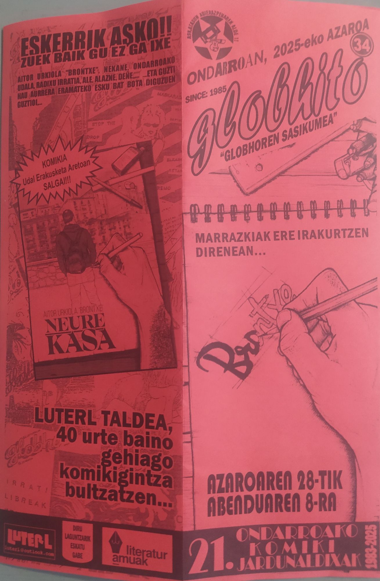 Ondarruko XXI. komiki jardunaldixan barrun,Komiki eta marrazki erakusketi eukikou herrixan. Azaroak 28txik Abendun 8rarte egongo da zabalik Udal erakusketa aretun “Marrazkixak ere irakurtzen direnean”erakusketi beran egillli Ondarrutar marrazkilaxe, AITOR URKIOLA “BRONTXE”.