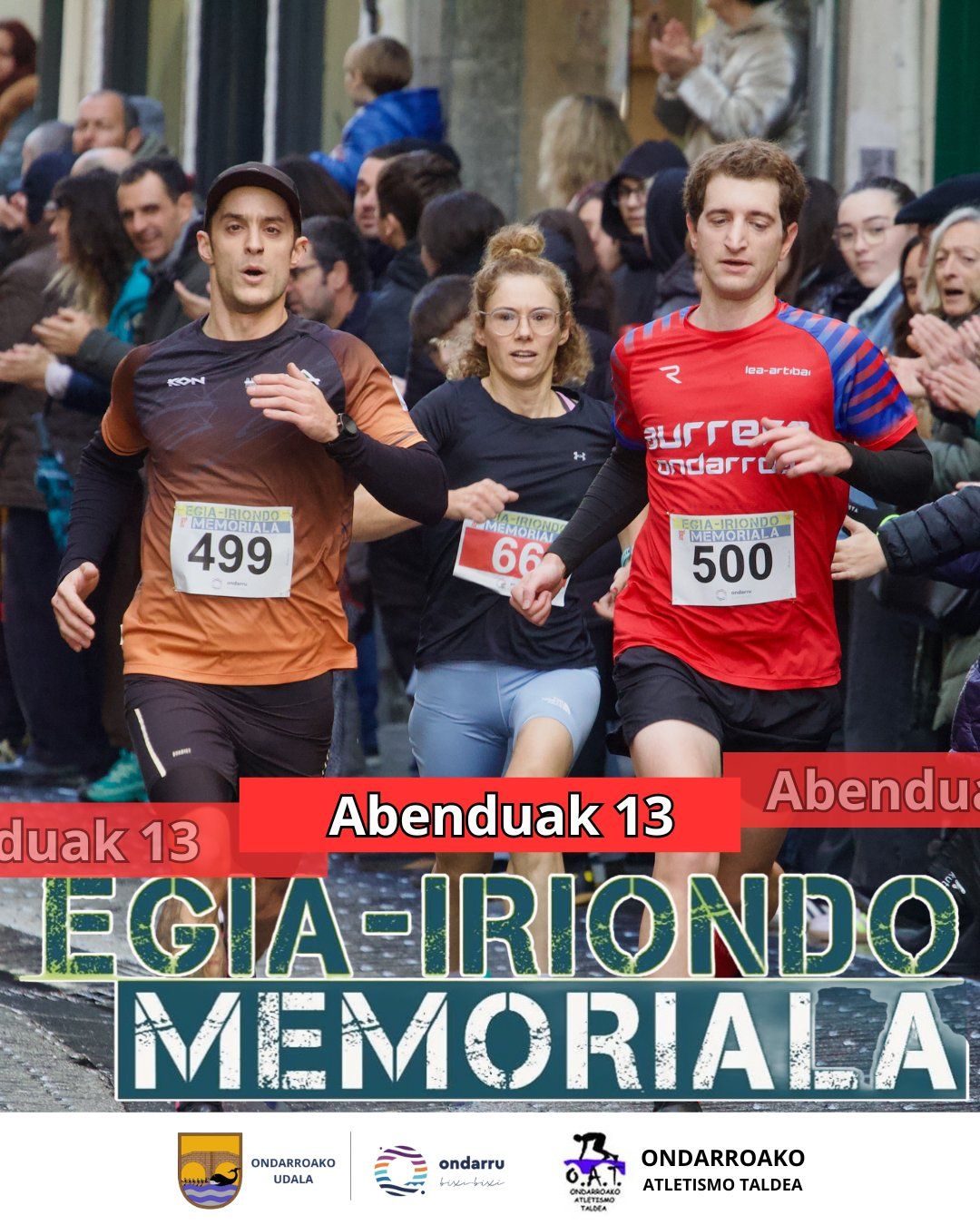 Gabonetako urteroko hitzordu de Egia-Iriondo memoriala. Aurten, abendun 13an (zapatu) eingo da Berritxutik Ondarruko Alde Zaharrearte etxen dan karreri. Ondarroako Udalak antolatu dau aurten be lasterketi, Ondarroako Atletismo Taldin laguntziaz. Lasterketa nausixe 12:00xetan hasiko da Berritxun eta berta juteko autobusak eongo diz, 11:20xin eta 11:40tan Astilleruko geltokitxik. Parte hartzalle guztik ixena emon birdabe dortsala jasoteko eta ixenak Turismo bulegun emon bihir diz. Entrenaten hasitxe zaze?