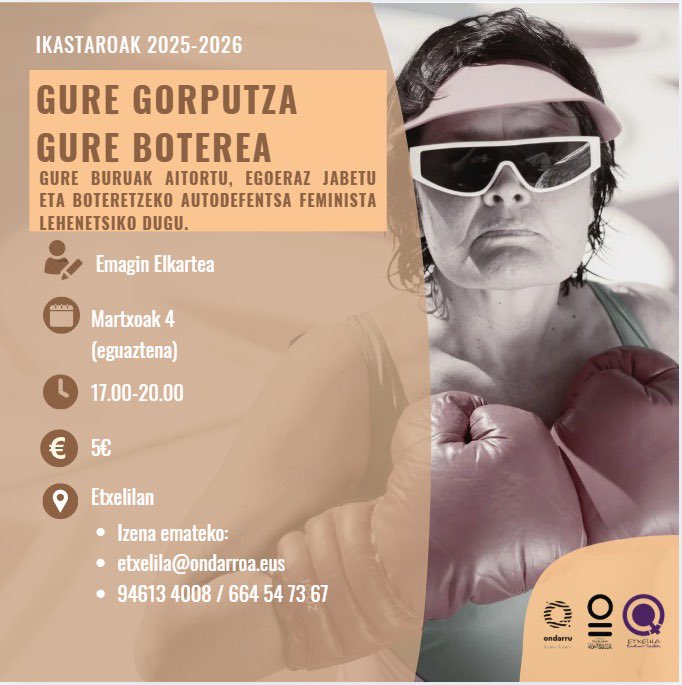 EMAGIN elkartin eskutik, ikastaru eskeiniko dabe Martxoak 4an (eguaztena) arratsaldeko 5etatik 8rak bittartin, GURE GORPUTZA GURE BOTEREA ixenburuaz. Bertan parte hartzeko ixena emon birde, Etxelian postan (beheko kartelin dakazue) bost euron trukin. Anima eta hartu parte!
