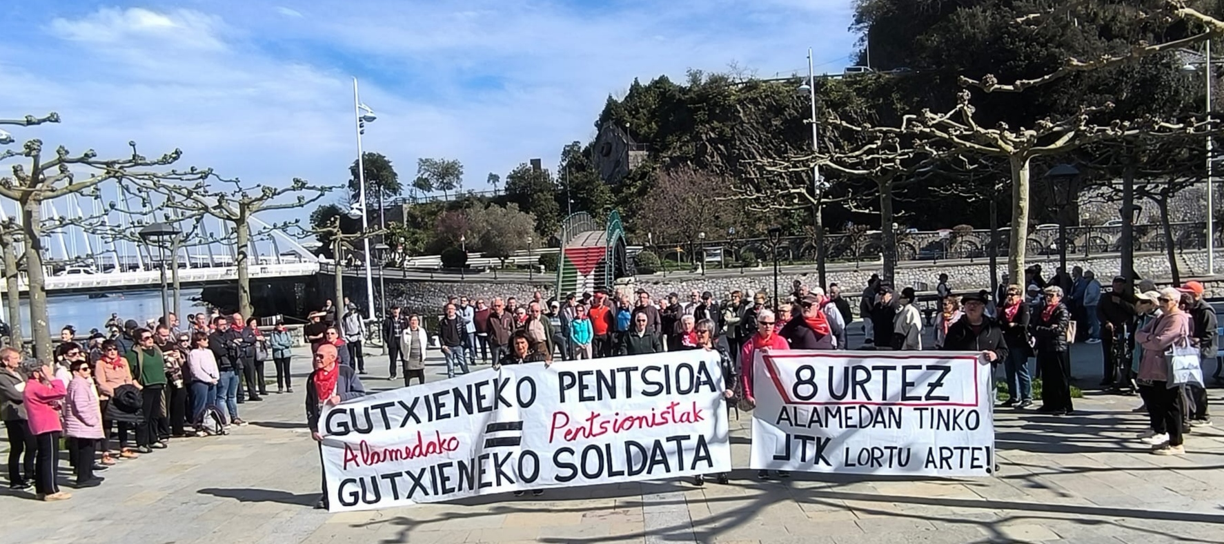 Martxoak lelengoko astelehena ta herriko PENTSIONISTAK ez dabe hutsik ein Alamedako konzentraziñoin. Gaur be 12xak puntun zabaldu dabez pankartak (gaur aspaldiko partez, egun eguzkitsuaz) GUTXIENEKO PENTSIÑO=GUTXIENEKO SOLDATI eta 8 URTE ALAMEDAN JO ta KE! ta euran atzin 115 herrittar, tartin alkati eta EH Bilduko bi zinegotzi.