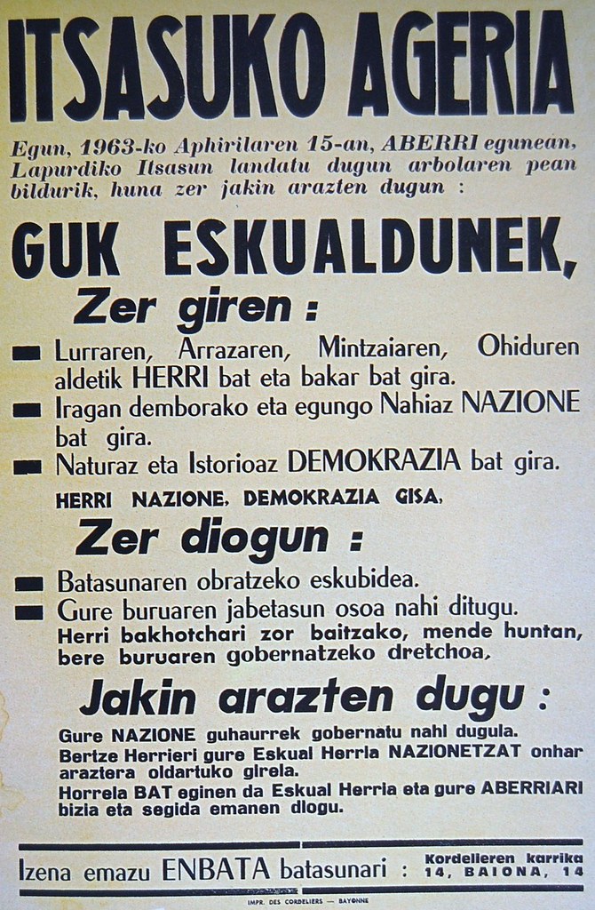 On arte, gure esku artin euki douen Aberri Eguneko argazki zaharrena 1964ku, Gernikaku, ixan da. Bañe ontzu hamen argitaratzen douena ailla gasku eskuta, 1963ku, hain zuzen be hauxe ixango litxake Ondarrutarren argazki zaharrena. Egixe da, 1964ku Frankismo garaixin Hego Euskal Herrixan ospatu zan lelengokutaku zala, bañe urtebete aurretik ITSASUN (Iparraldin) batu zinak be eon zin. Franko garaiko Abertzalin hastapenak zin eta hegoaldin errepresiñoi gordiñe pil pillin euan bittartin, Iparraldin askatasun haxik mugitzen hasitxe euazen. Euran gandik gatoz, danak junde daz mundu honetatik, bañe kimuk aurrea jarraitzen dabe. Gora gu ta gutarrak!