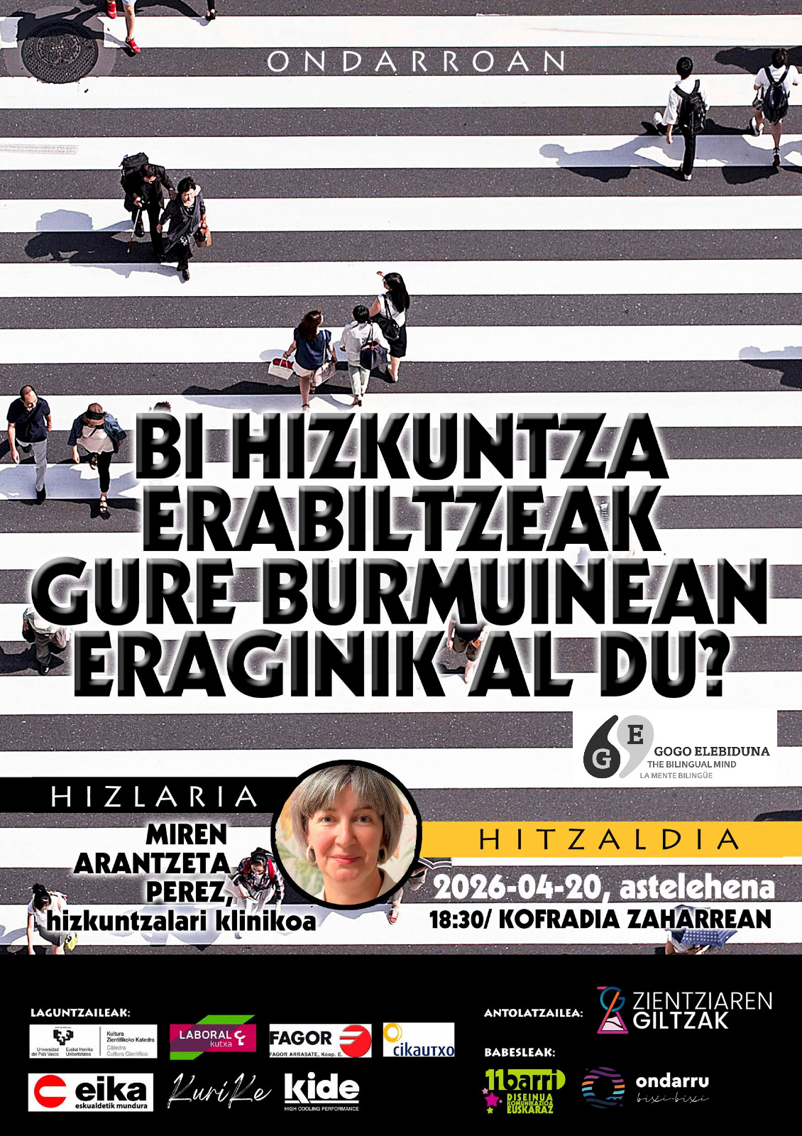 Apirileko hitzaldixe eukikou apirilak 20xan (astelehena) Kofrai Zaharrin arratsaldeko 6:30xetan Zientziaren Giltzak elkartik antolatute. Ixenburu lez, BI HIZKUNTZA ERABILTZEAK GURE BURMUINEAN ERAGINIK AL DU? Hizlari lez, MIREN ARANTZETA PEREZ Hizkuntzalai kliniku etorriko da. Zer pasaten ete gasku burun barrun berba etxen douenin jakin nahi dozu? Hurreatu entzutea!