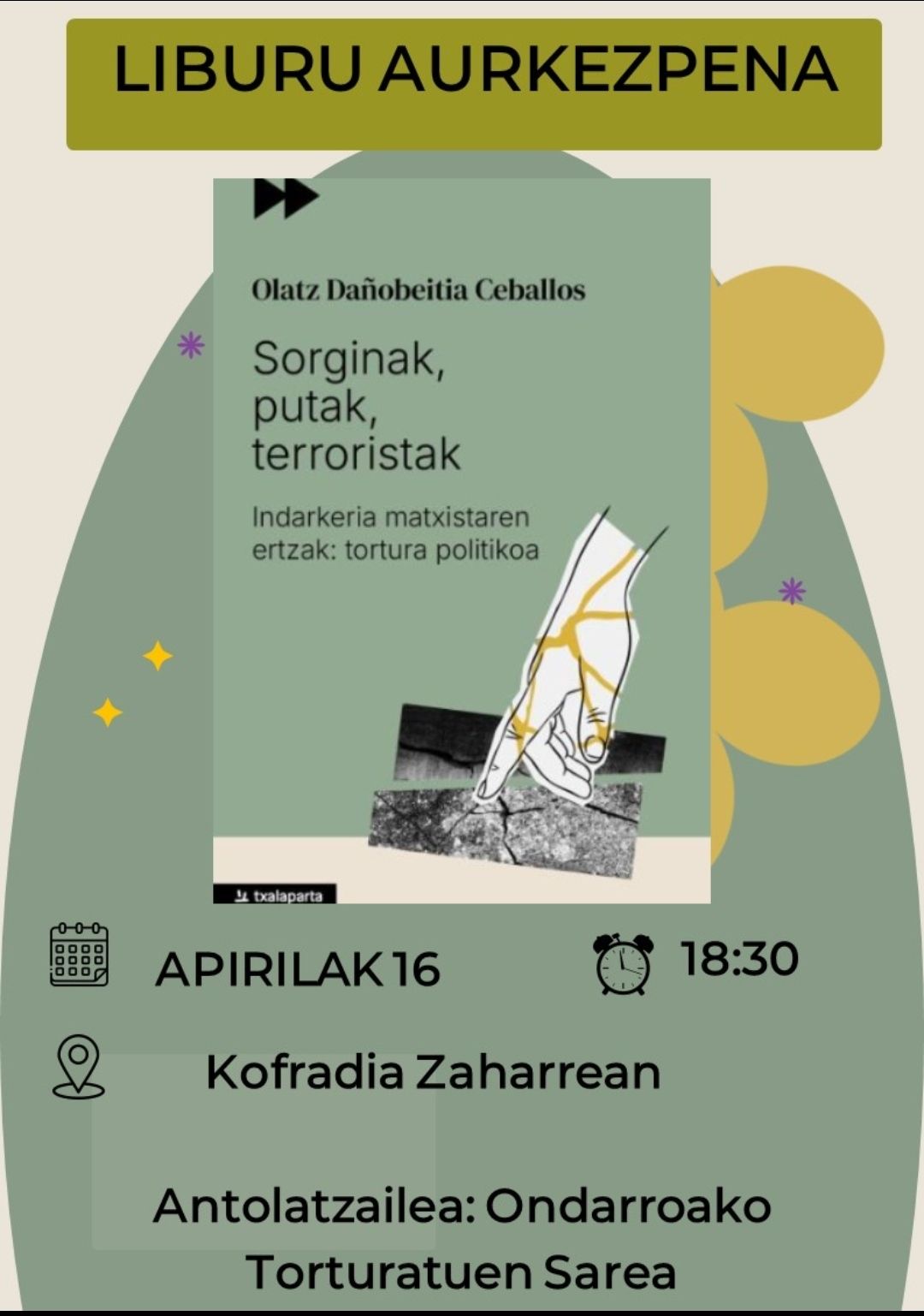 Beraz badakixue, datorren eguenin (16an) Kofrai Zaharrin aurkeztuko dabe liburu arratsaldeko 6:30xetan SORGIÑAK, PUTAK, TERRORISTAK. Antolatzalli, Ondarruko Torturatun sarea.