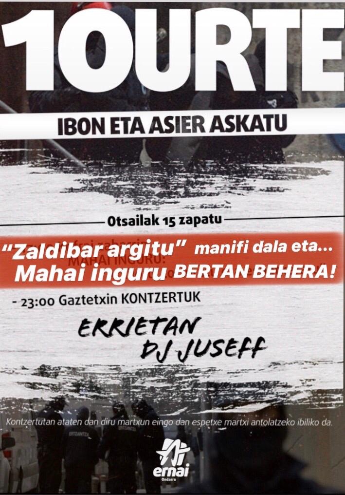 Ondarruko Ernaik, “10urte! Ibon eta Asier askatu!” Dinamiki ipini dau martxan. Hasiera baten mahai inguru antolatute baeuken be, Zaldibarko ezbeharran inguruko manifi dala eta bertan behera laga dabe.