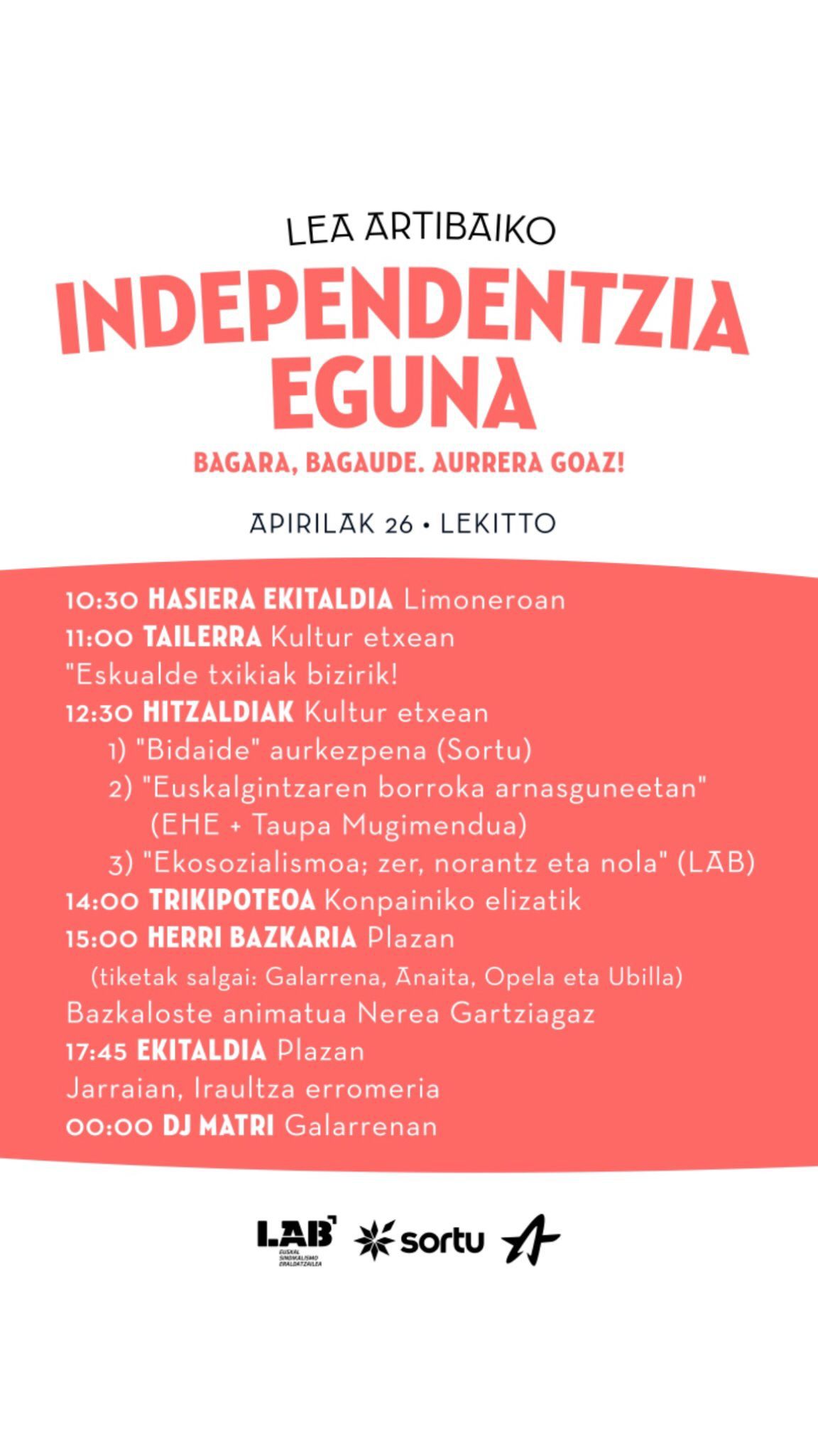 Lea-Artibaiko Ernai, Sortu eta LABek INDEPENDENTZIA EGUNE antolatu dabe Apirilak 26 (zapatu) egun guztiko egitarauaz Lekatxon.