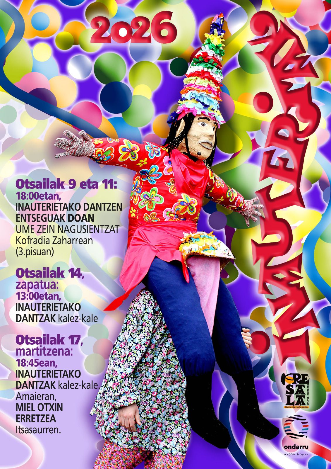 Hasi diz aurtengo IÑAUTEIXETAKO egitarauk agertzen ta lelengokutaku KRESALA K.E.ku ixan da. Otsailak 14 (zapatu) eta otsailak 17 (martitzena) ospatukou herrixan aurten karnabalak bañe horren aurretik dantza ikastaru antolatu dabe Otsailan 9 eta 11ako Kofrai Zaharreko 3.solairun ume zein nausixantzako. Mozorru presta eta danok dantza, anima zeube!
