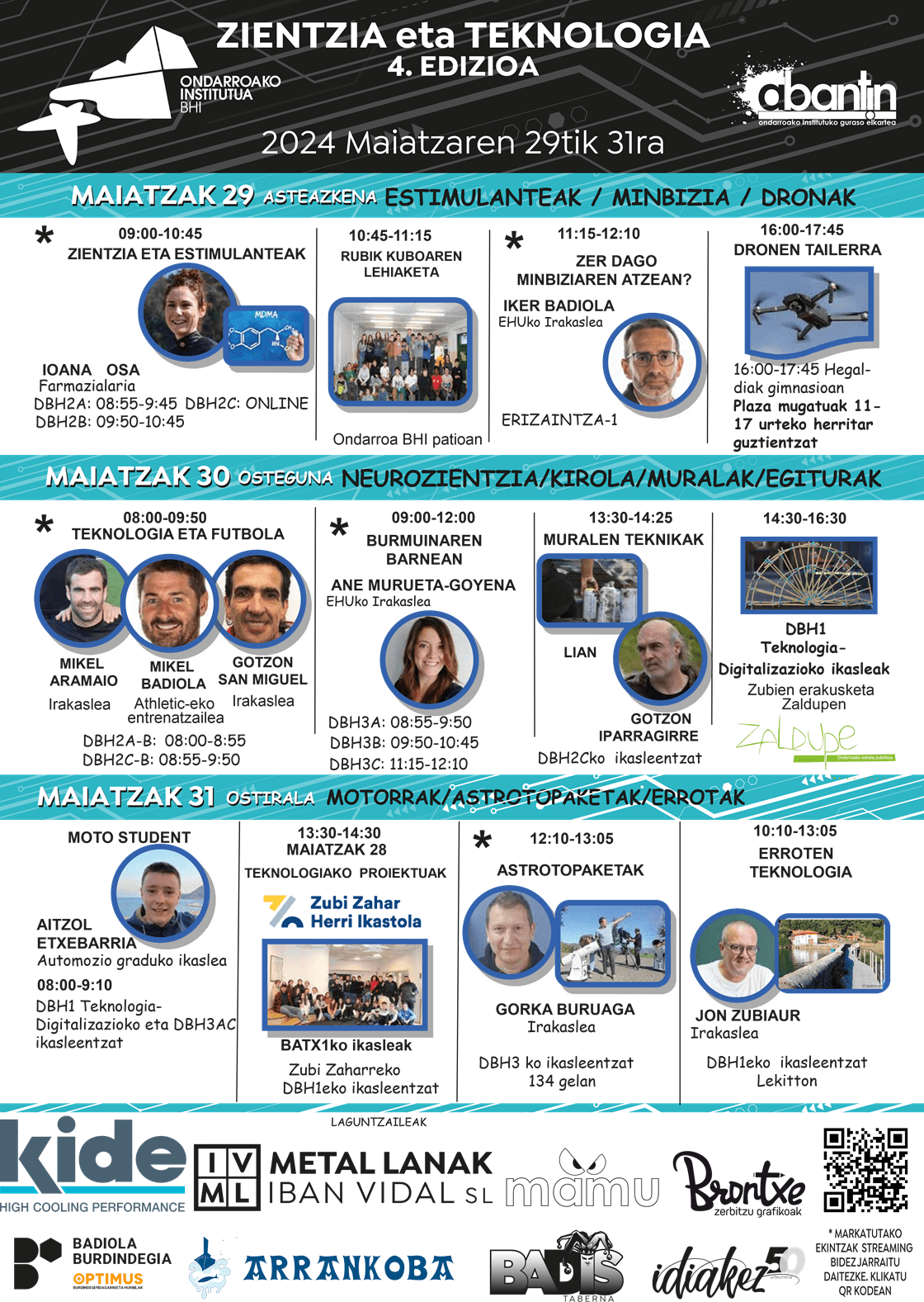 Laugarren urtez Ondarroa BHIk Zientzia eta Teknologia astea antolatu du, eta egitarau oparo bat prestatu dute hitzaldi eta tailerrez osatua. Eguaztenean [maiatzak 29], estimulanteei eta minbiziariren inguruko saioak eta dronen tailerra egingo dituzte. Eguenean [maiatzak 30] teknologia eta futbola, burmuinaren barnean eta muralen teknikei buruzko hitzaldiak egongo dira. Barikuan [maiatzak 31], ostera, motorrak, astrotopaketak eta erroten teknologia landuko dituzte saio ezberdinetan.