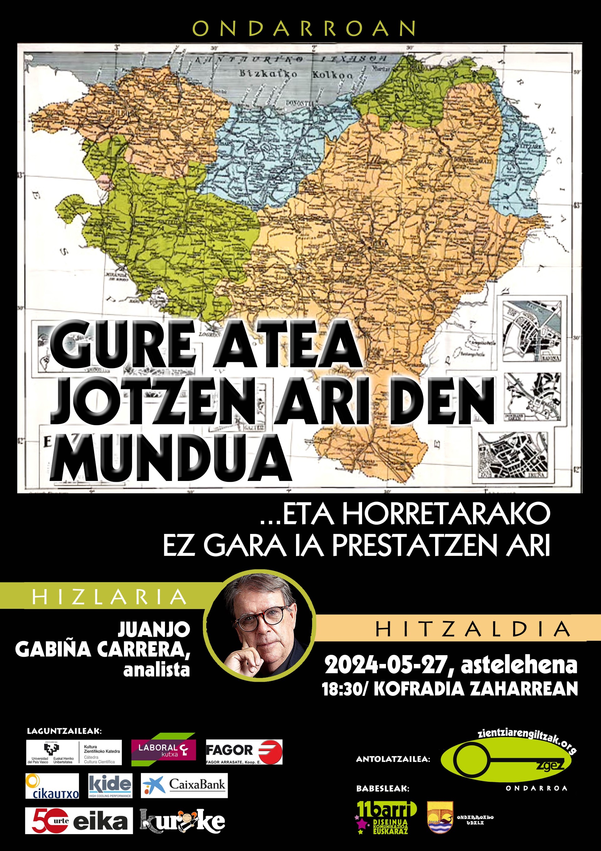 Maxatzeko hitzaldixe eukikou ongoxe astelehenin (M-27) arratsaldeko 6:30xetan Zientziaren Giltzak Elkartik antolatute Kofrai Zaharrin. GURE ATEA JOTZEN ARI DEN MUNDUA ipinitze hitzaldiko ixenburu eta hizlari lez JUANJO GABIÑA CARRERA analisti eongo da. Gai interesgarrixan itxuri dauke, hurreatu entzutea!