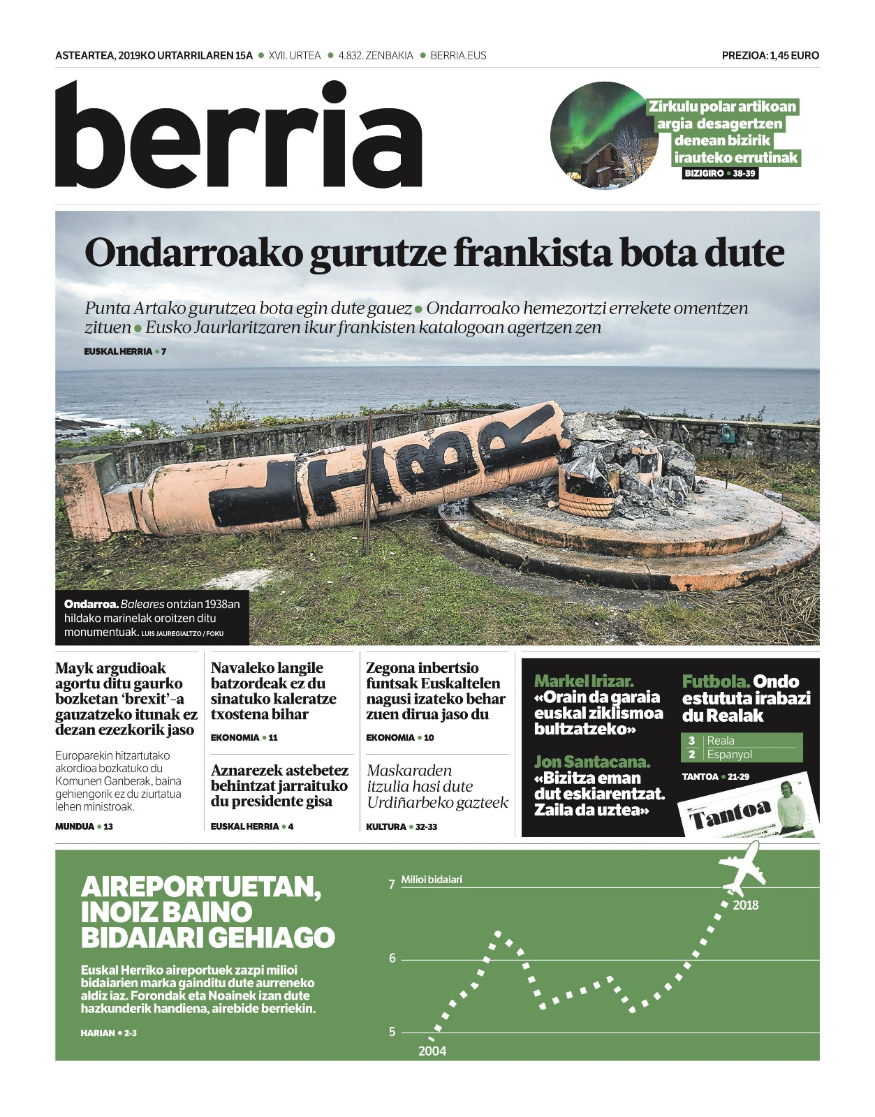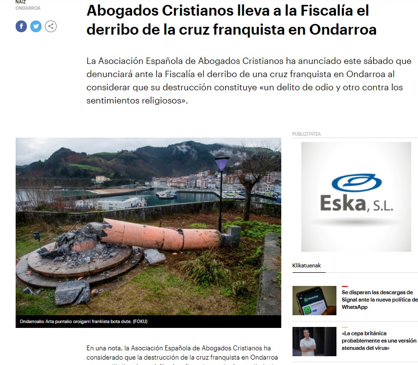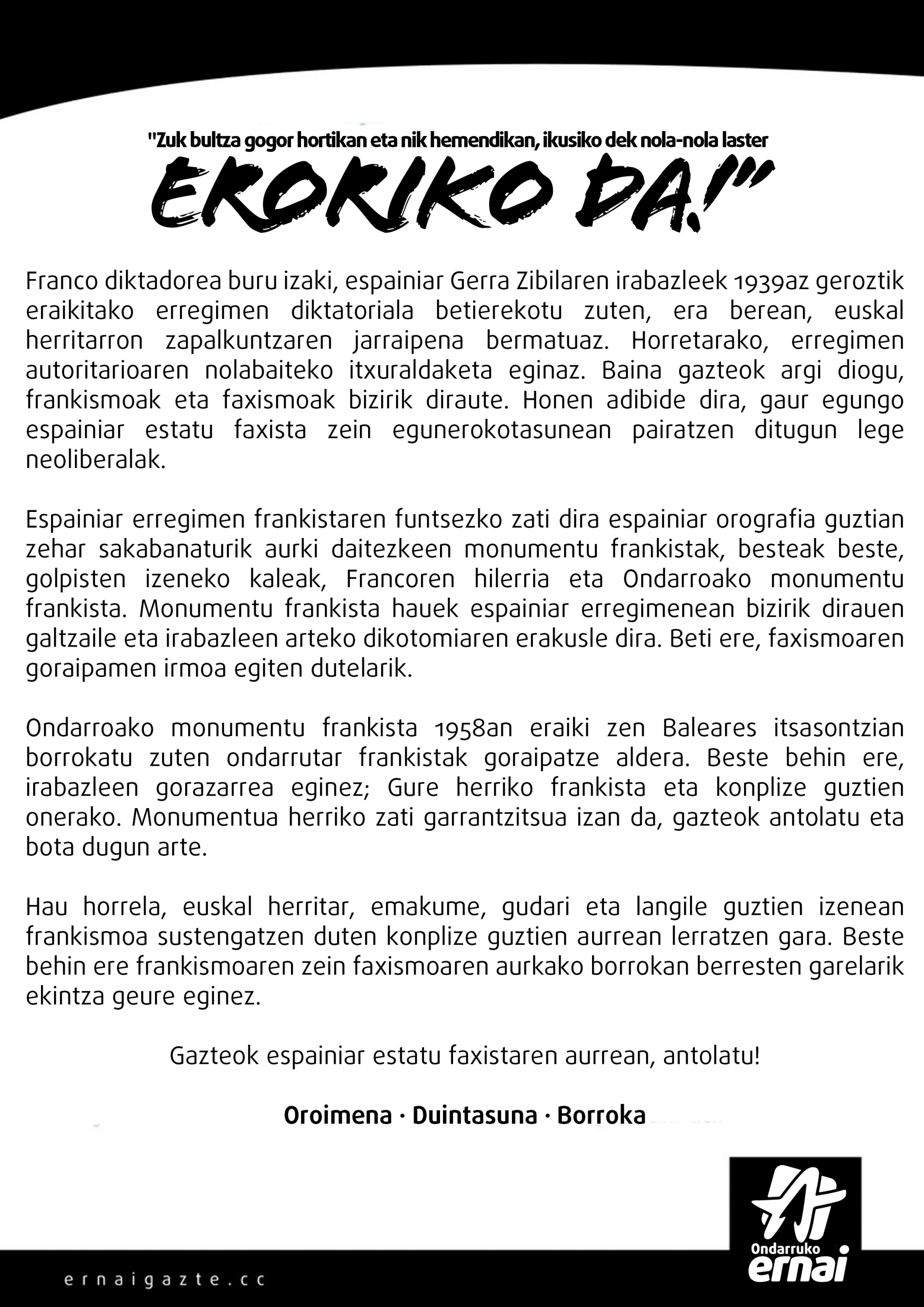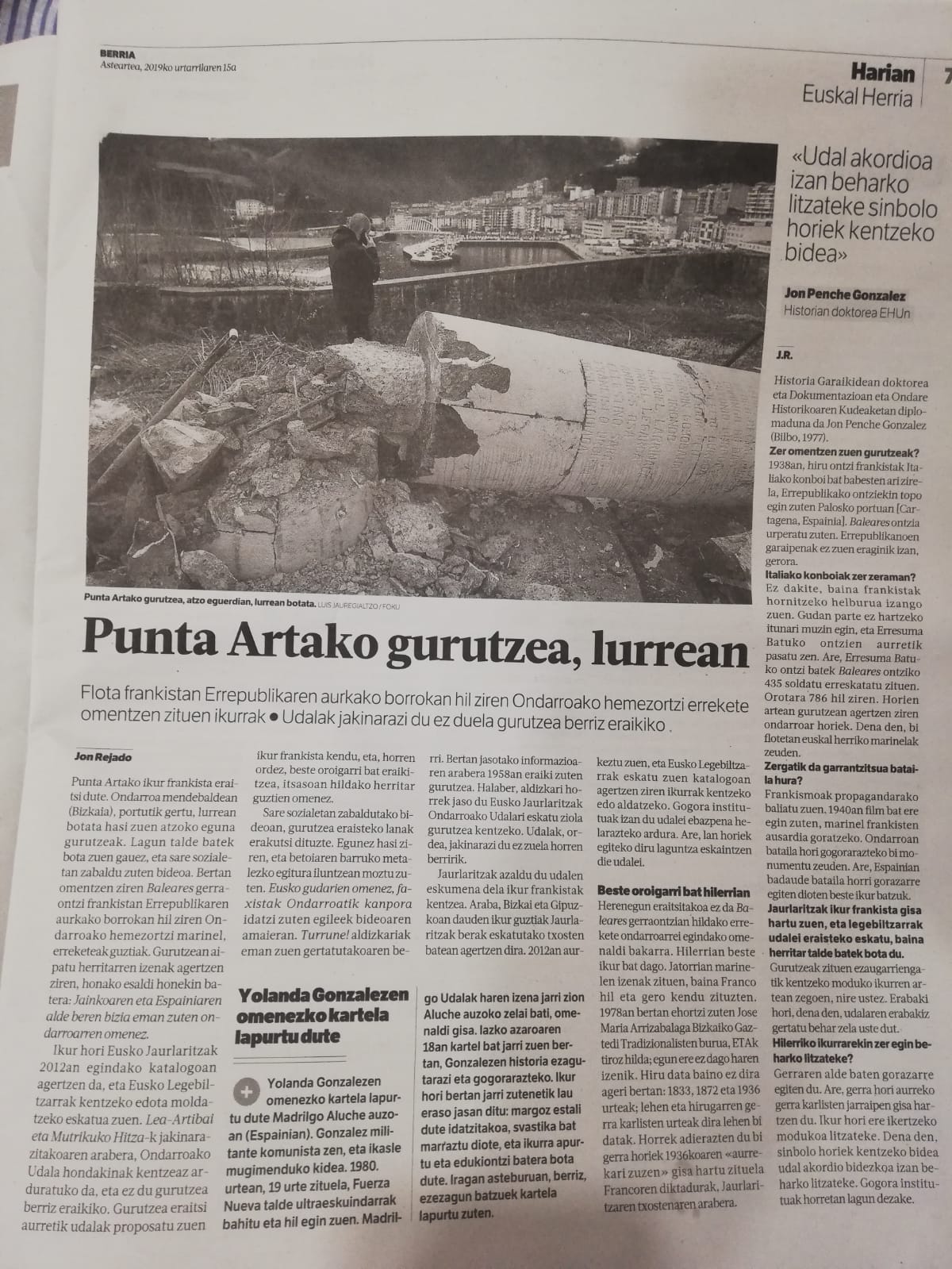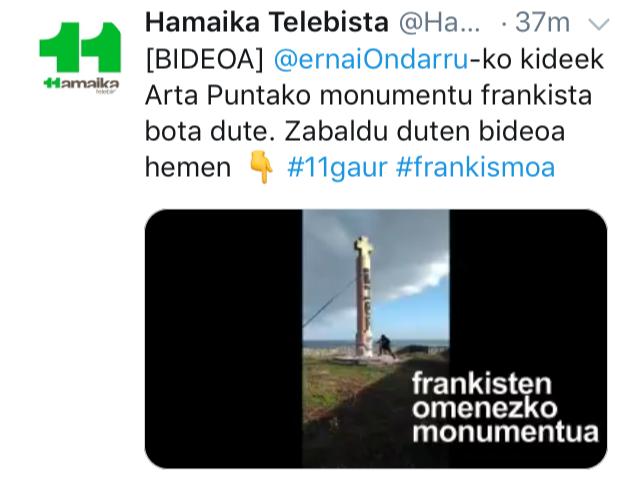 Gaur, urtarrilak 13, urte bi pasa diz Arta puntan euan monumentu frankisti botata agertu zanetik. Argitalpen honetan, gurutze frankista horren esannahixe, eraitsi ebeneko momentu gogorarazi eta ondoren egon zin erreakziñoik aztertuko douz.
