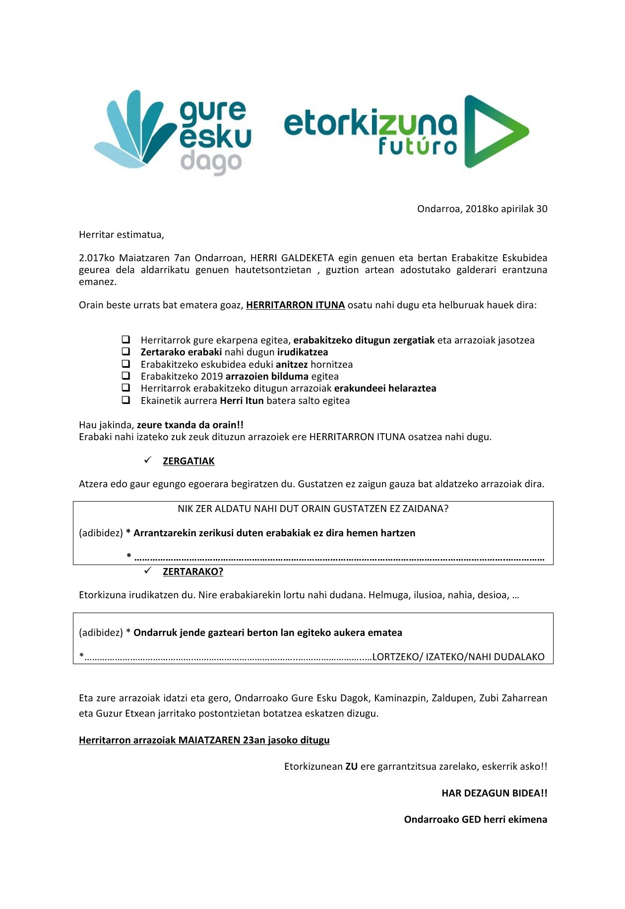 Arrazoi honek batzeko herriko buzoi guztitxa orri bat aia da, paper hori bete eta bakotxan arrazoi ero aportaziñoiaz herriko leko ezberdinetan banatute dazen buzoitxa botateko aukeri eukiko dou.