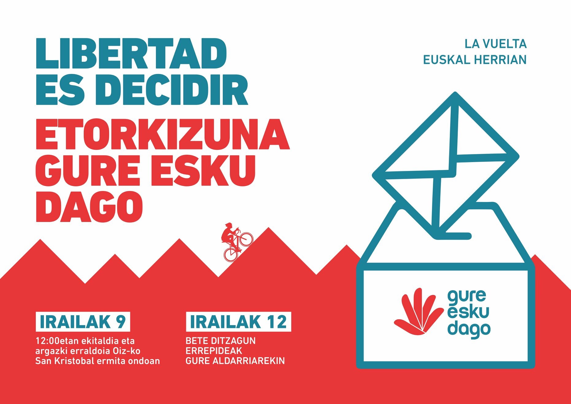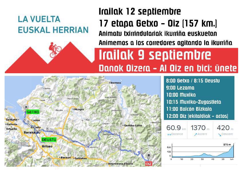 Españiko “La Vuelta” txirrindularitzako itzuli arrotza pasako da bixar (irailak 12) Euskal Herriko errepiditatik. Honen aurrin, eragile eta mugimendu ezberdiñak errepide eta itzulixe pasako dan tokixetan aldarrikapenak, banderolak, ikurriñak… atateko deixe ein dabe!