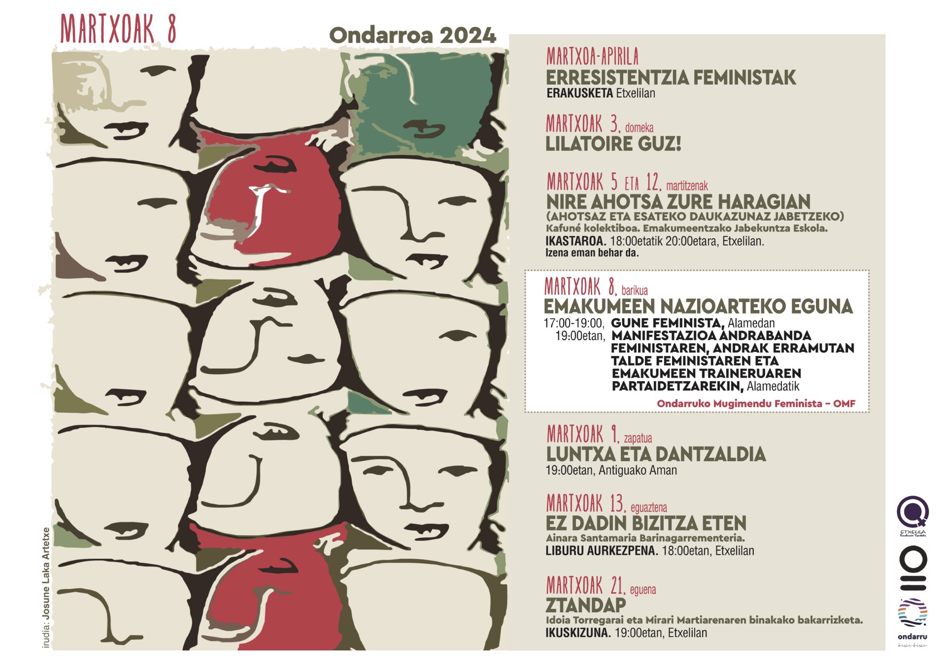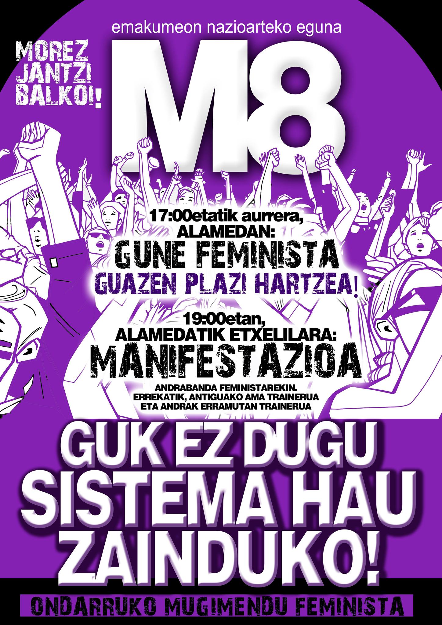 Herriko eragile feminista desberdinen eskutik eta Martxoak 8xe bera ardatz hartute aldarrikapenez beteta eta kaleak hartzeko dexe eginez egin dabe deialdixe. Horren ingurun egitarau zabala prestatu dabe, azpixan ikusiko dozuen latxeik. Batu zeube BORROKA FEMINISTA!