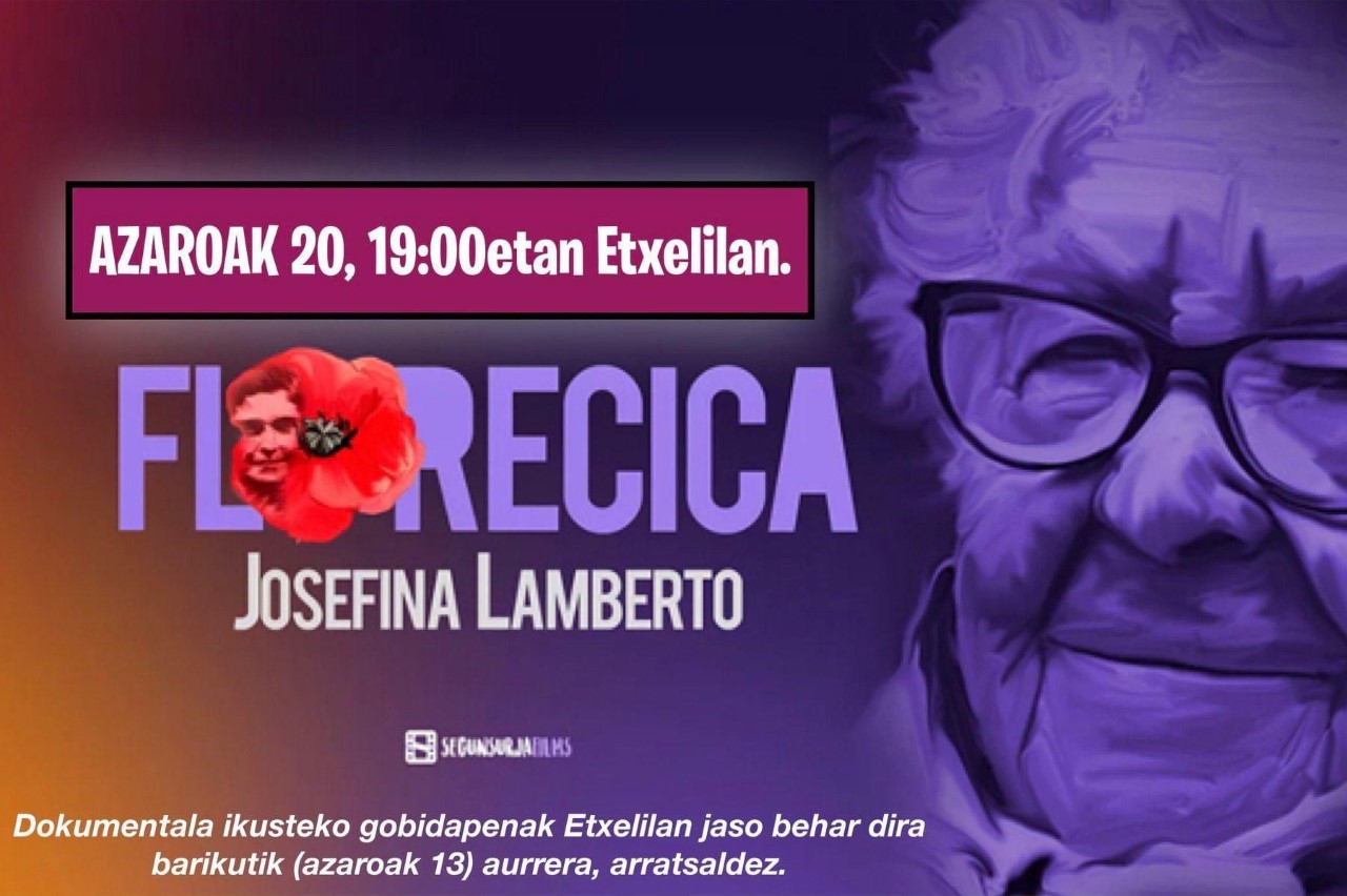 Josefina Lamberton bixitxi erakusten daben ‘Florecica’ dokumentala eskainiko da Etxelilan, azaroan 20an, baixakun, 19:00etan. Ezagune eizan MARAVILLASen ahizti zalako, bañe beran bixitxi oso aberasgarrixe ixan zan. Beti egon zan bigarren lerrun, gaztetaz 30 urte elixin “morontzan” gero Nafarruko memoixa historiku berreskuratzen jo ta ke ibili zan ta beran bizitzako amaieran Paris 365 jantoki sozialin esku bat botaten egon zan.