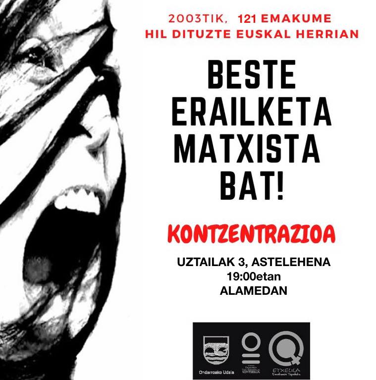 Cortesko (Nafarroa) emakume bat erahil du bere senarrak; Euskal Herrixan aurten indarkeixa matxistik hildako beste emakume bat. Hori salatzeko, elkarretaratzea deitxu dau Ondarruko Udalak, gaur, 19:00etan Alamedan. NAHIKURE!