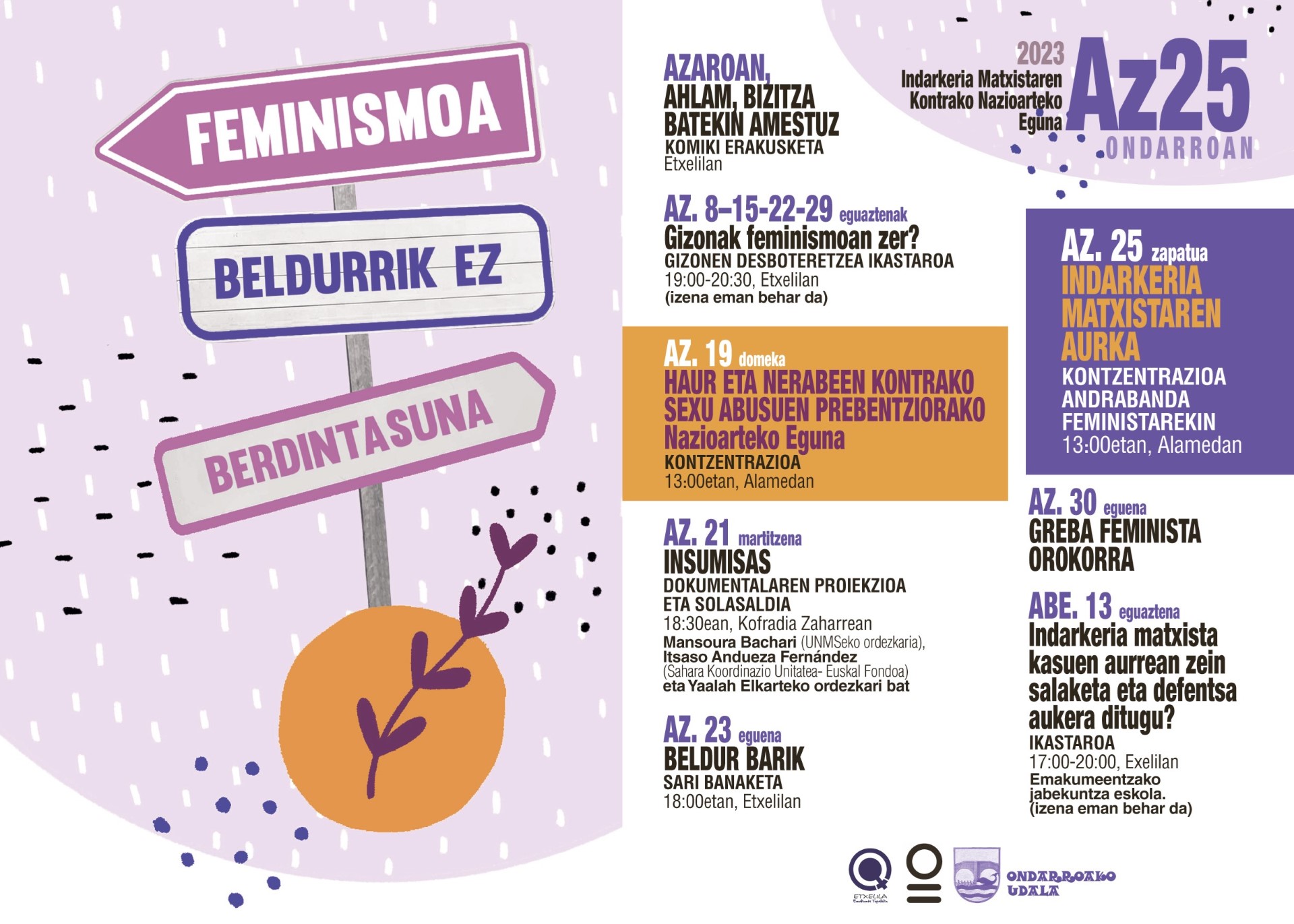 Azaroaren 25eko Indarkeria Matxistaren Kontrako Nazioarteko Egune dala ta, egitarau zabala antolatu dabe udalan berdintasaun sailak eta Etxelilak. Danon arazu dalako danok kontzientzixa biga!Hartu zeuk be parte eingo dizen ekitaldixetan!