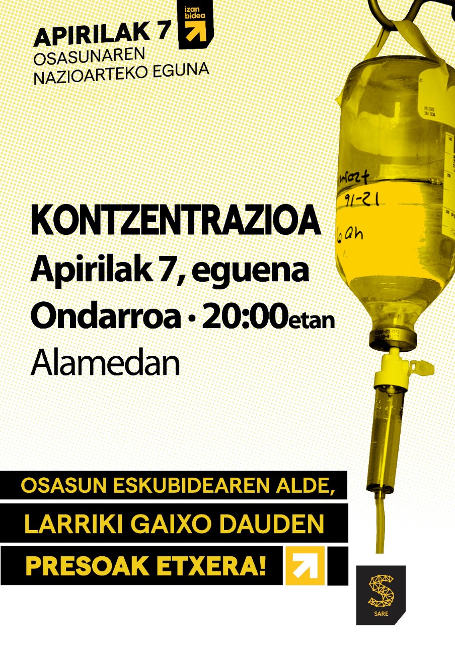 Osasunan nazioarteko egune ospatuko eguenin (A-7), hori dala ta Alamedan batuko gaz arratsaldeko 8 retan. Larri gaixo dazen PRESUK askatzeko eskatzen dotzau Instituziñoiai, giza eskubidik daukelako kartzeletan dazenak be.