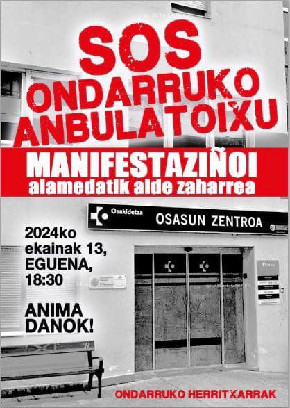 Ezta guk esaten douelako, Ondarruko anbulatoxure bueltatxo bat etxi gomendatzen dotzuau, bertako langillik salatu dabe egoera hau eta paetak betetxuez euran eziñegona azaltzeko. Aspaldiko kezki de hau ta gero ta okerraua du eta egunen baten errementa eingo da (ia gauza txarrik ez dan pasaten). Datu konkretuk emoten dotxue, gaurko egunez: 3 Mediku eta Pediatri falta diz Kamiñazpiko osasun etxin eta gañea ordezkoik ezta! Noiz arte jasan geinke egoera hau? Ein ixan douz konzentraziñoik egoeriai soluziñoik eskatzeko, eztozku jamonik ein. Kalea urteten jarraitxu bikou bestelan egoeri okertzen jungo da. Osasungintzi gaxoik da Ondarrun!