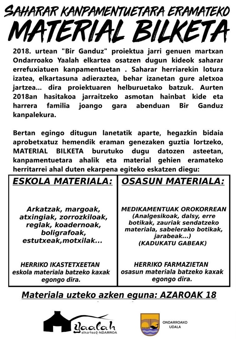 2018an hasitxako “Bir Ganduz” proiektuai jarraipena emoteko abendun kanpamentuta bertaratuko da herritxar talde bat. Bidai hori aprobetxatuz, saharar errefuxiatuk bixi daben egoera gogorra lehuntzen launtzeko eskola mateixala era osasun mateixala nahi dabe erun. Horretako ikastetxe eta farmazixetan bilketi ipini dabe martxan.