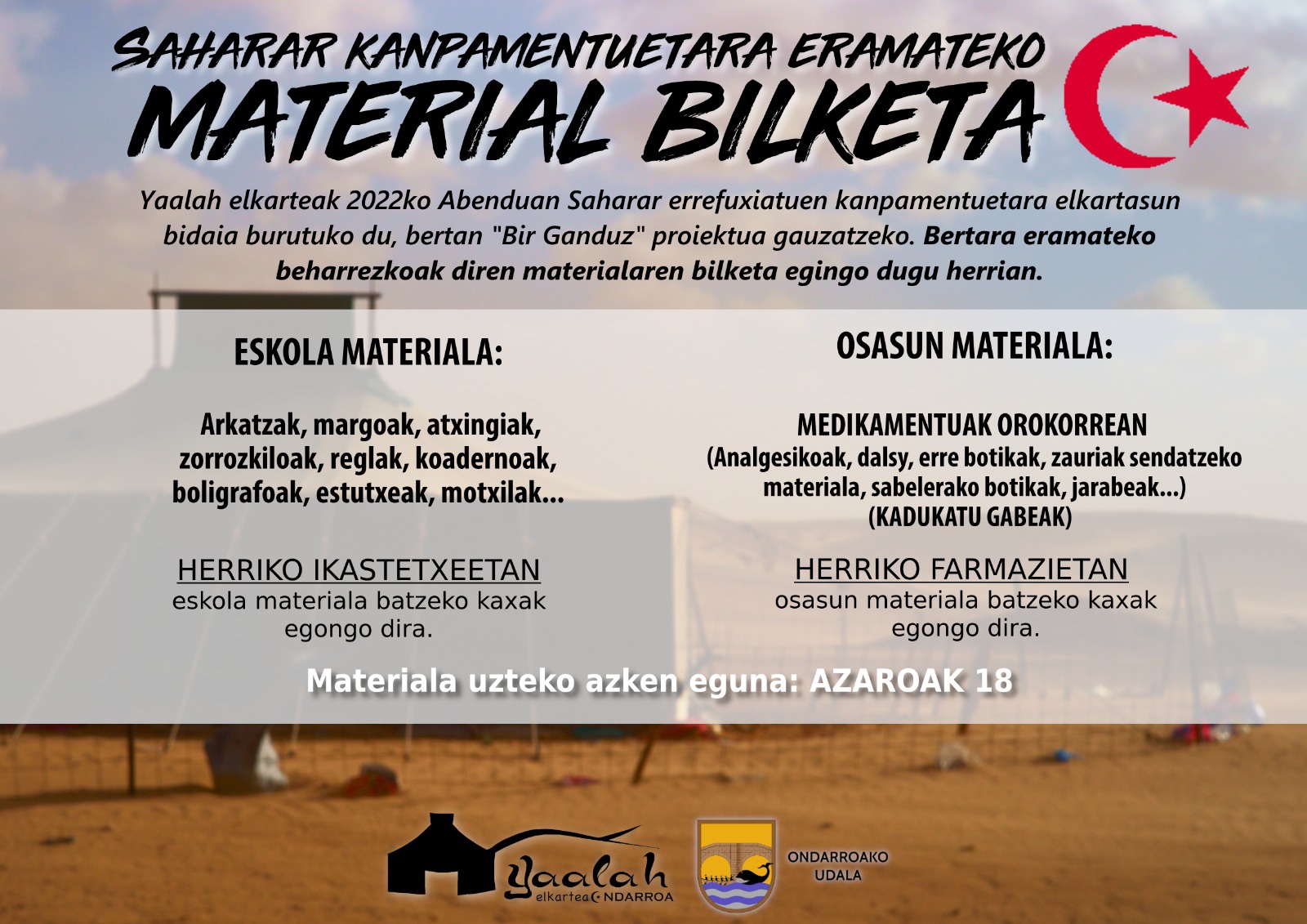 Ondarruko saharar herrixan aldeko Yaalah elkartik saharar errefuxiatun kanpamentuta eruteko mateixal bilketi ipini dau martxan.