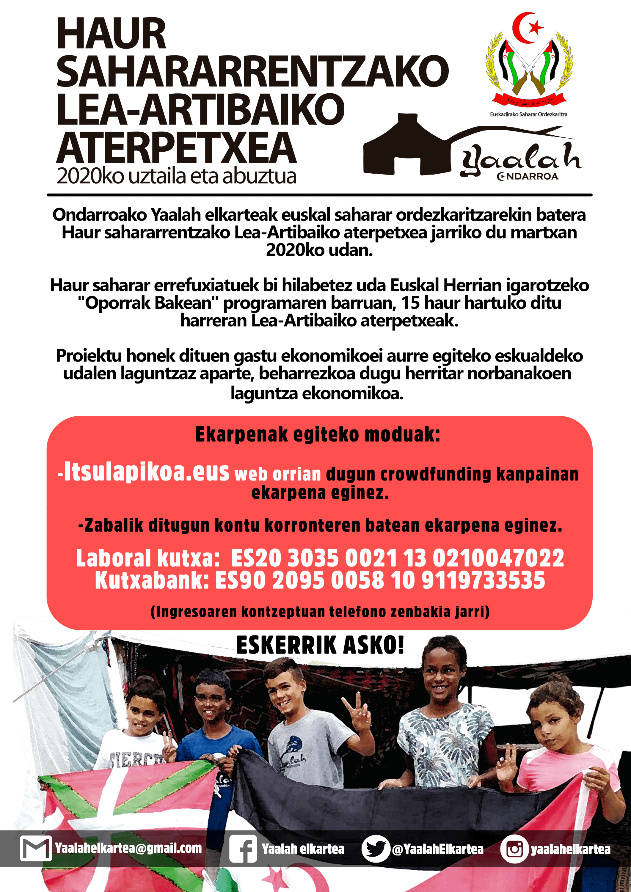 Yaalah elkarti, euskadiko saharar ordezkaritziaz batea proiekto barri baten da murgilddute. 2020ko uda ko hile bixin saharar errefuxiatun kanpamentutako umik hartukotxuez Lea-Artibaiko aterpetxin. Proiektu honen helburu nauzixe, eskualde mailan dan harrera familixa kopuru urrixai irtenbidi emoti de eta Euskal Herrixan dazen beste aterpetxik eredu hartute darue aurrea proiektu hau.