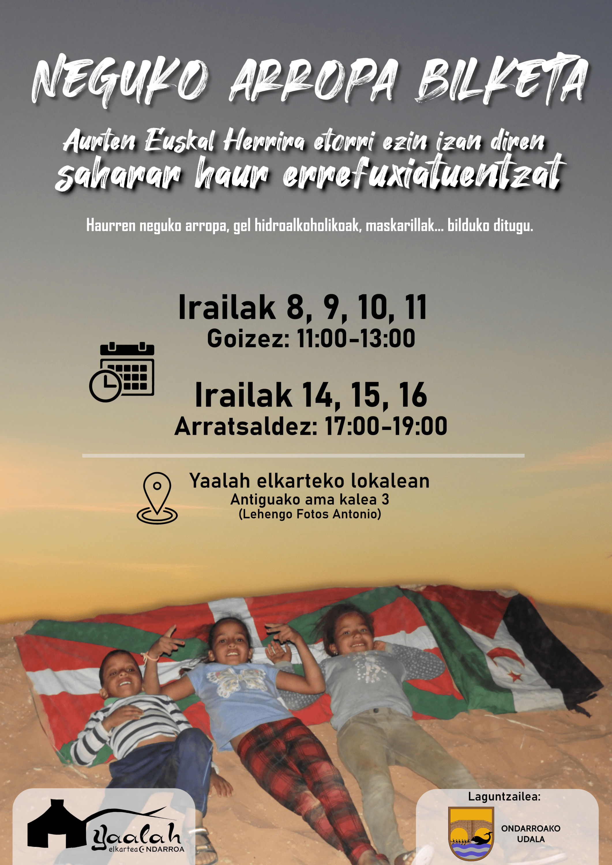 Saharar herrixan aldeko Yaalah elkartik aurtengo udan Oporrak Bakean programiaz etorri ezin ixan dizen ume sahararrantzako neguko erropan bilketi ipini dau martxan. Erropaz gain, gel hidroalkoholikuk eta maskarilak be batuko dotxuez.