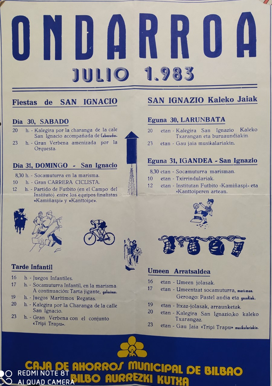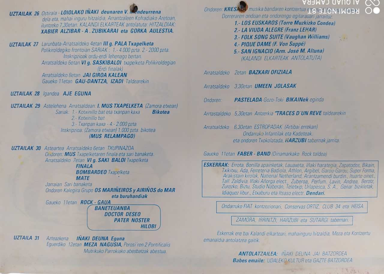 Aspaldi gaztik ixati laga douenok gaurko eguneko oroitzapenak gogun dakauz. Celedonio eskolako jolas tokixan parranda asko botatakuk gaz ta faltan botaten douz urte haiek. Gau pasak, sokamuturrak, txozna inguruko anbienti, errekako jolasak…Hamen dakazue gure artxibun topa douzen urte horretako egitarau desbardiñak, zihur gaz argazkixak be eongo dizela sasoi hartakuk, guk gustoa gordeko genduke. Animaten bazaze korreo honeta bixaldu: otzara@hotmail.com