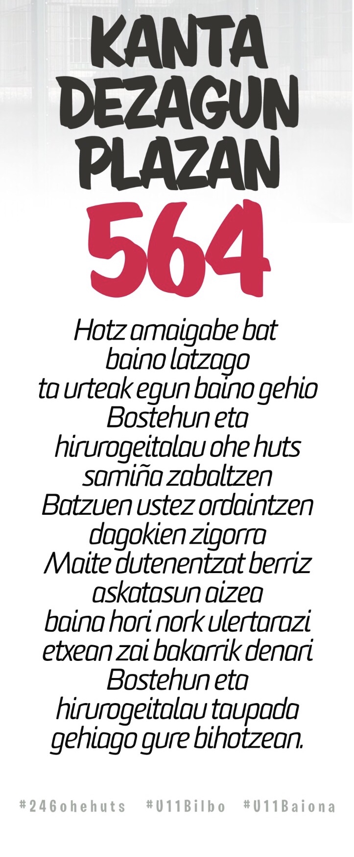 Amatxori behin eta berriz galdetzen diot: – ” Noiz aterako da aita espetxetik?” – Eta hark, pazientzia eta itxaropena izan behar dugula esaten dit, helduko dela askatasun eguna!