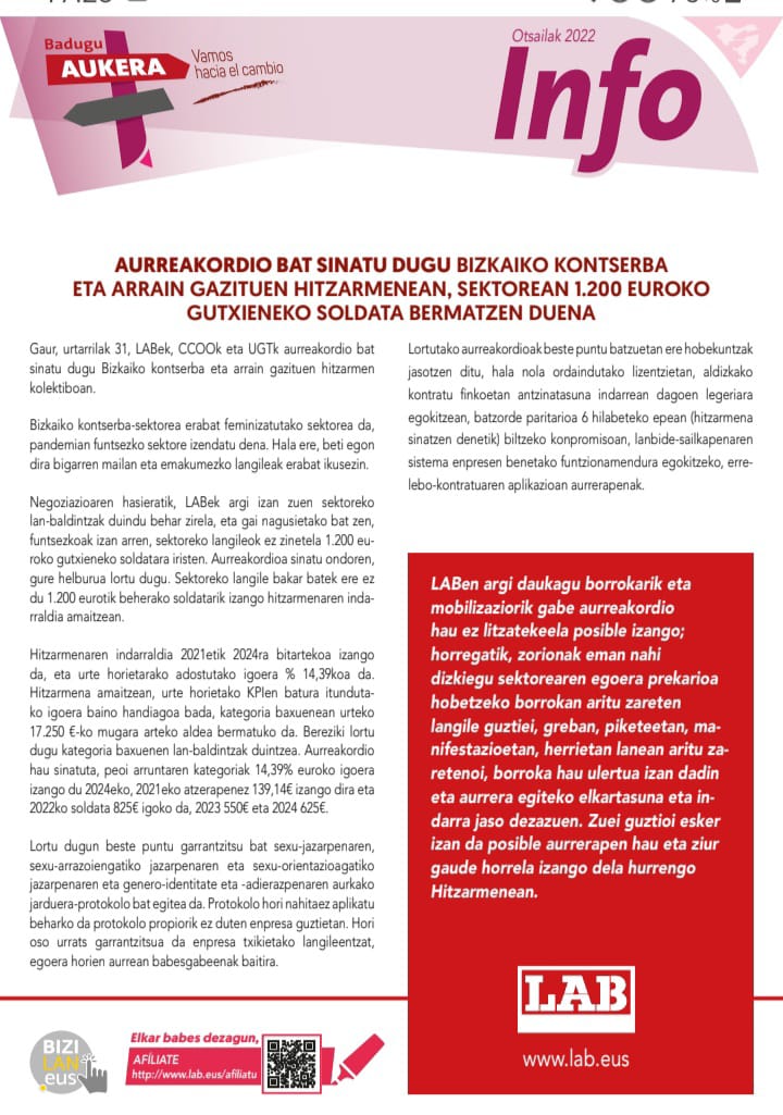 L.A.B. sindikatuk atzo batzartu zitxun eskualdeko delegatu sindikalak Ondarruko Kofrai zaharrin. Bertan, arduradunak azaldu ben latxeik, martxan dazen hauteskunde sindikalan inguruko barrixak emon ben eta pozik agertu zin langillik L.A.B.eko zerrendaik emoten dazen babesaz eta ataten dazen emaitzakin. Ondarruai dagokixonez, egonkortu eitxuez lengo emaitzak, Zubi-Zahar ikastolan, Kalare Deuna kofraxan… beste alde batetik, delegatu barrixe lortu dabe Udaletxeko Funtzionaxutan. Eskualde mallan, Itsaskorda enpresan eta Lea-Artibaiko mankomunidadin delegatu guztik lortutxue. Gogoz beteta eta indarberritxute eidaz diñue L.A.B eko arduradunak eta hamendik aurreako plangintzi lantzen jarraitxuko eidabe.