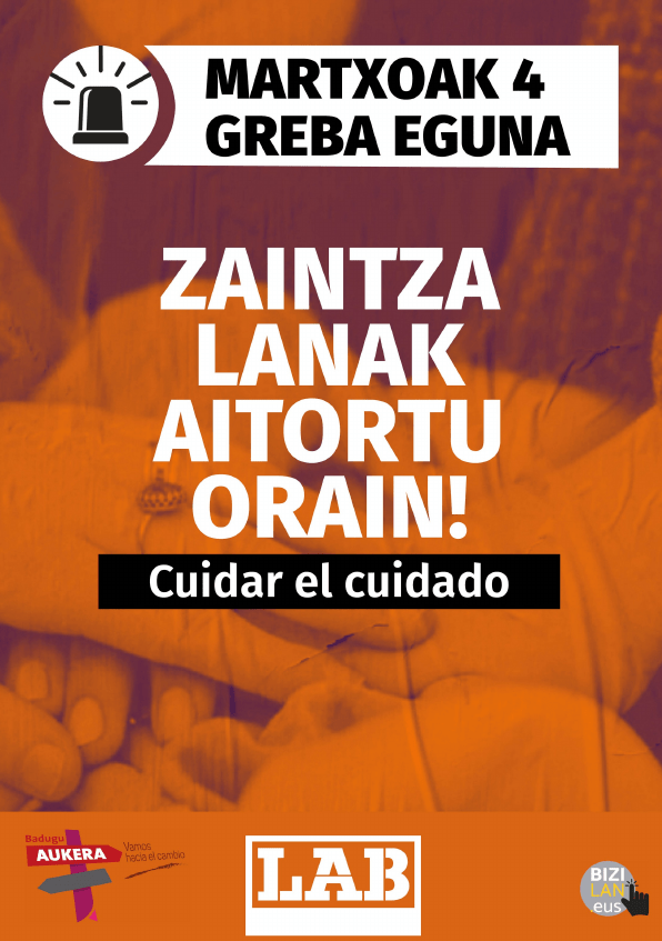 Baine ze kondiziñoitxan daz langile honek? Prekarizata, kontrato lotsagarrixakin, soldata miserablikin, lan ordu amaigabikin… Hau dana salatzeko eta zaintza lanak bir dizen modun aitortzi aldarrikatzeko grebi da deitxure Martxoak 4rako.