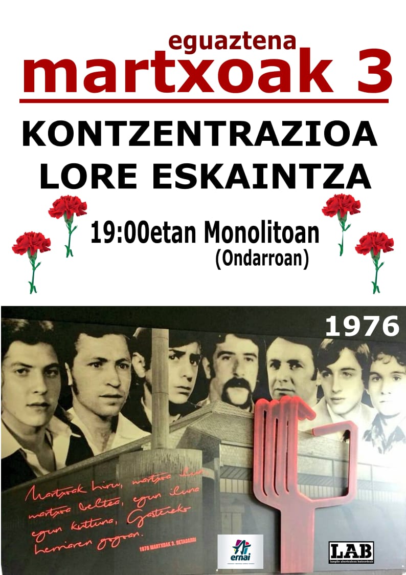 Ondarruko LAB eta ERNAIk 1976an Gasteizen erail ben langilik omentzeko ekitaldixe antolatu dau. Martzun 3an (eguaztena) 19:00etan monolitun ixango da ekitaldixe.