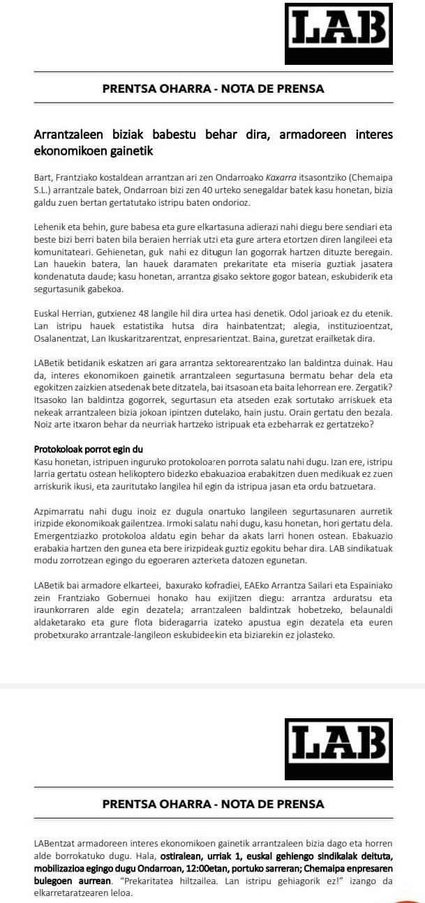 LAB sindikatuk prentsa ohar hau kaleratu dau gertatutaku salatzeko. Bertan, arrantzalik jasaten daben lan baldintza gogorrak salatu eta langilin osasune eta ongizati armadorin irabazixan gainetik ipini bir dizela azpimarratzen dau.