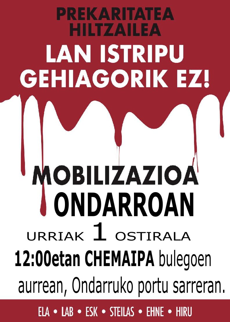 Gexengo sindikalak mobilizaziñoi deitxu dau baixako honetako (Urriak 1) Chemaipa enpresin bulegutako parin 12:00etan.