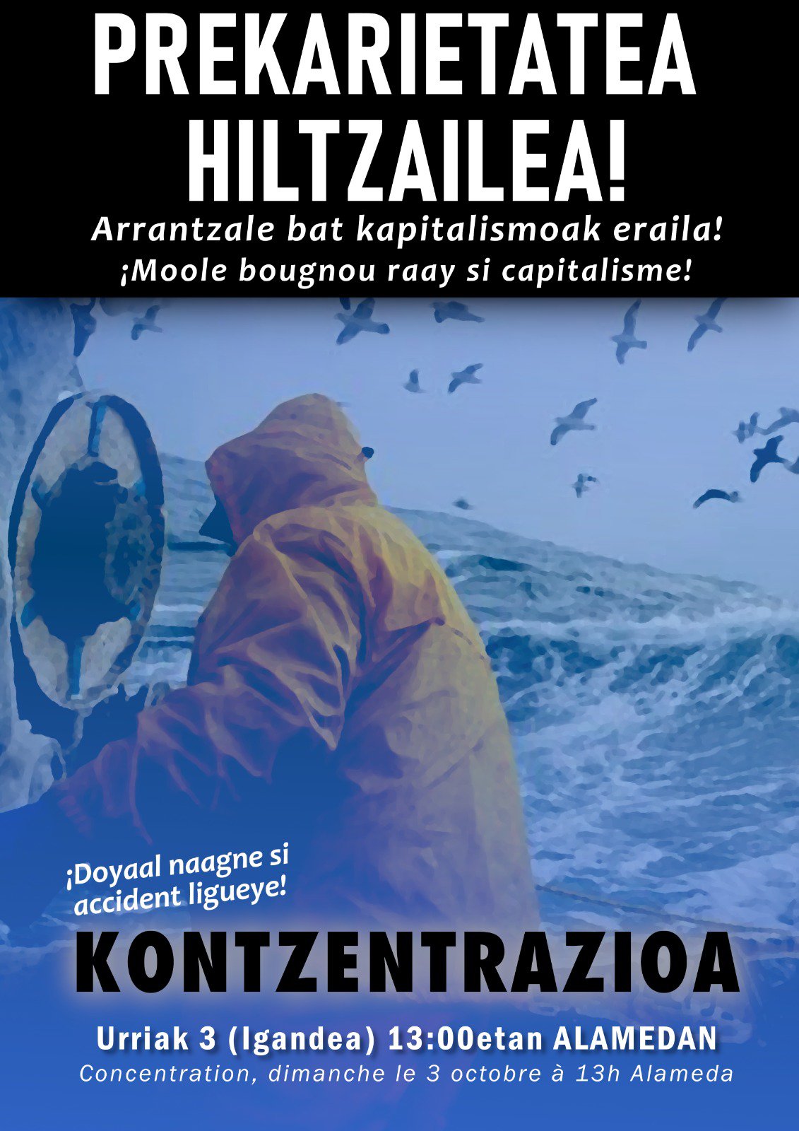 Prekarietatea hiltzailea! lemapin burutuko da protesta hau, hain zuzen be, prekariedadi dalako egunerokotasunin herriko arrantzalik bixi dabena euran lanpostutan.