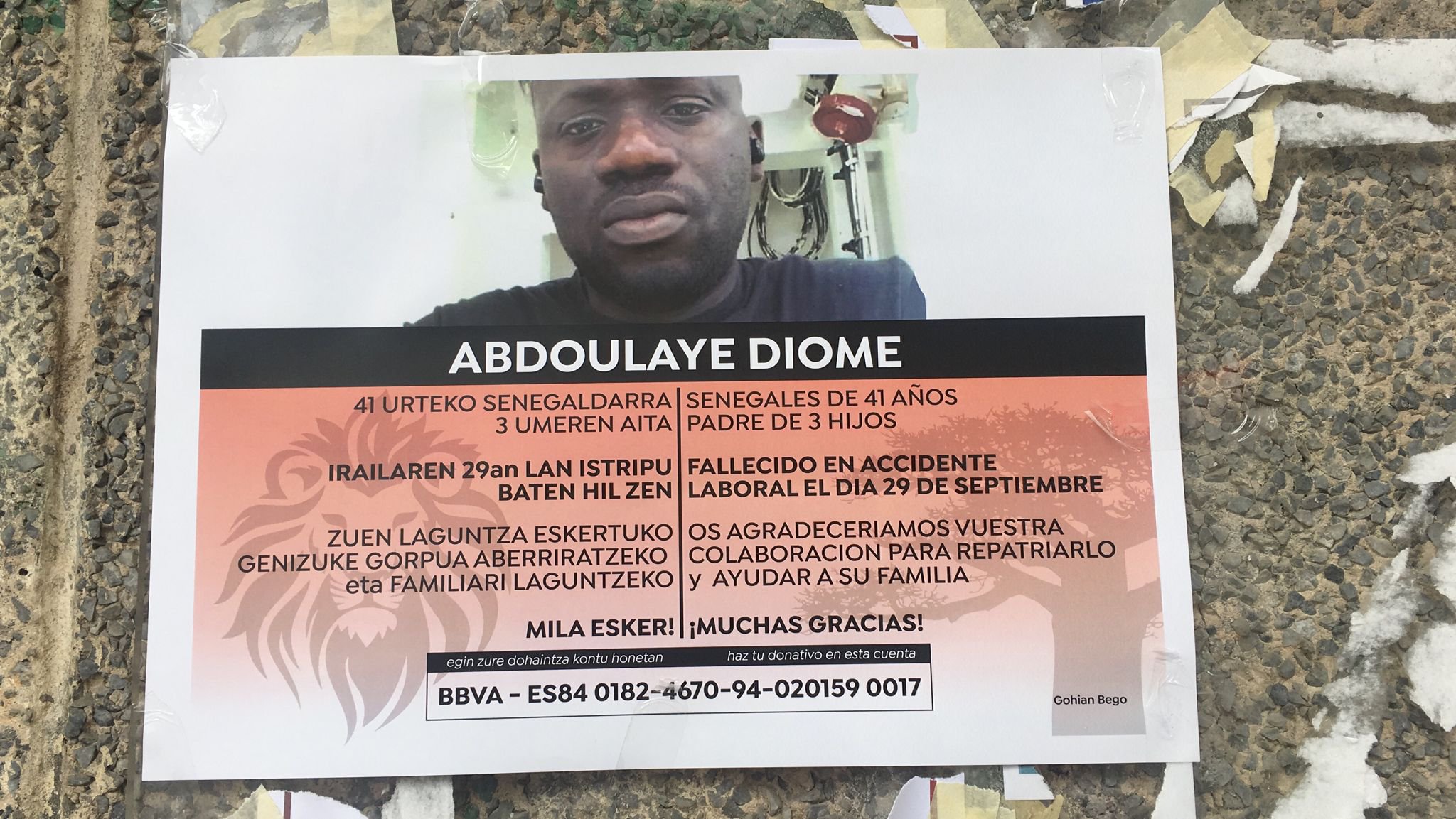 Jatorri senegaldarreku zan Abdoulaye Diome arrantzali. Kalin kartel honek daz ipinitxe gorpu aberriratzeko herritxarrai elkartasune eskatzen.