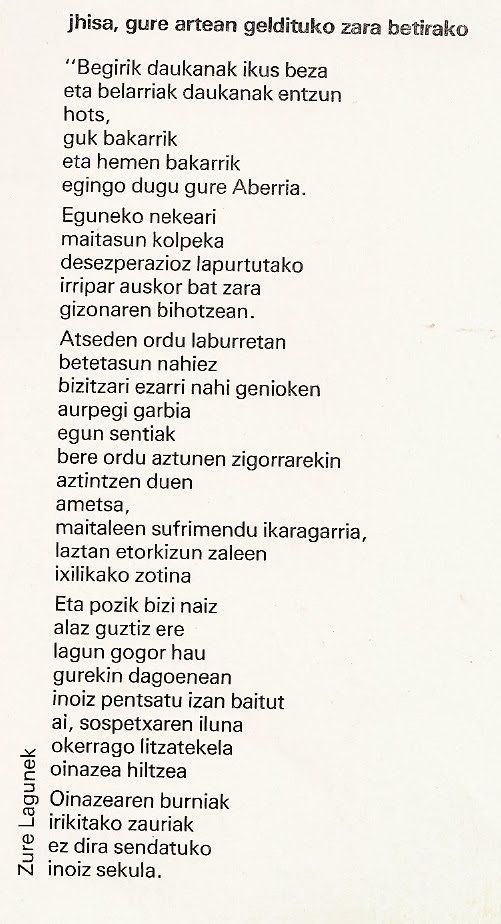44 urte pasa diz 1976. urteko Martxoan 3an, Gasteizen, polizi armatuk bost langile hil zituenetik. Pedro Maria Martinez de Ocio, Francisco Aznar, Romualdo Barroso, Jose Castillo eta Bienvenido Pereda Zaramagako Asisko San Frantzisko elixan euazen, langile grebalarixan batzar baten parte hartzen. Polizixik elixi gaseatu eta bertan euazenak tirokatu ei zitxuezen; bostak hil zin, egun berin edo ondorengo egunetan. Manuel Fraga Iribarne (P.P. alderdiko sortzalletako bat) zan sasoi hartan Barne Ministru, eta 2012an hil zan, Gasteizko sarraski horreatxik epaitu ixan gabe. Fragaz gain, beste ixen bat euan egoera horren ardurapin: Rodolfo Martin Villa (Sindikatu Harremanetako Ministru).