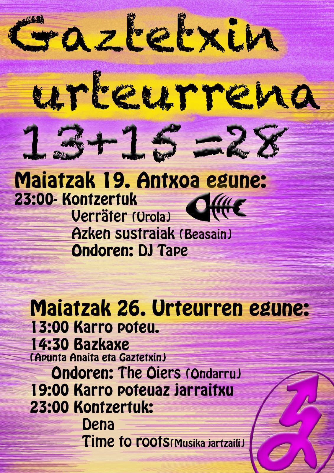 Gaztetxin 13+15=28 urteurrena be ondo baino hobeto ospatute gelditxu zan! Eguerdixan karropoteu, bazkaxe, kantaldixe, barriro karropoteu eta gabaz kontzertuk eta musika jartzaili egon zin gaztin etxin! Zoixonak eta urte askotako!