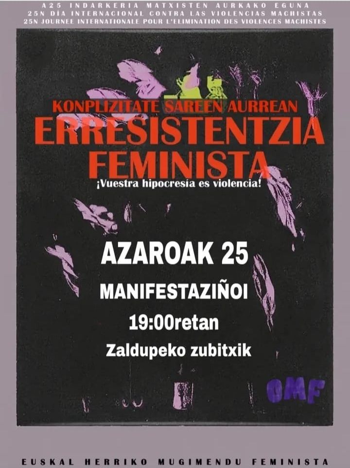 Ondarruko maugimendu feministik deitxute manifestaziñoi eingo da INDARKEIXA MATXISTIN AURKAKO NAZIOARTEKO EGUNIN (A-25) aldarrikatzeko. Zaldupeko Zubitxik urtengo dau arratsaldeko 7retan manifestaziñoik. Kartelak diñon latxeik, Konplizitate sarin aurrin, ERRESISTENTZIA FEMINISTA! Bat ikutzen badabe, DANOK ikutzen gatzulako! Etorri zeu be.