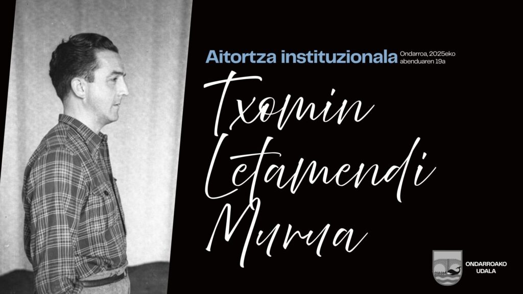 Ondarruko udalak aitortza instituzionala eingotza gaur abenduak 19 (baixaku) eguerdiko 12:00xetan TXOMIN LETAMENDI MURUAi. Kofradia Zaharreko bigarren solairun egingo da ekitaldixe eta beran herixotzin 75.urteurrenan bexperan eingo da ekitaldixe.
