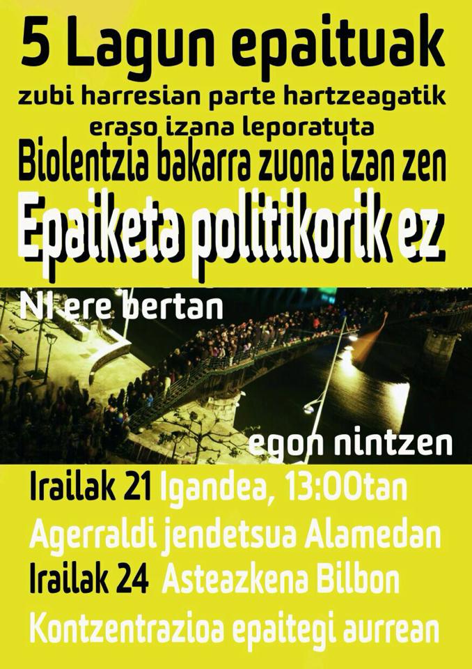 2013ko maxatzan 15in Ondarruko zubi harresixan parte hartzeatxik bost lagun epaituko dotxue eguaztenin Bilboko auzitegixan. Bostai ertzainak erasotzi leporatzen dotze. Epaiketa hori salatzeko, domekan (irailak 21), elkarretaratze jendetsu eitteko deitu dabe Ondarruko Alamedan, 13:00tan.