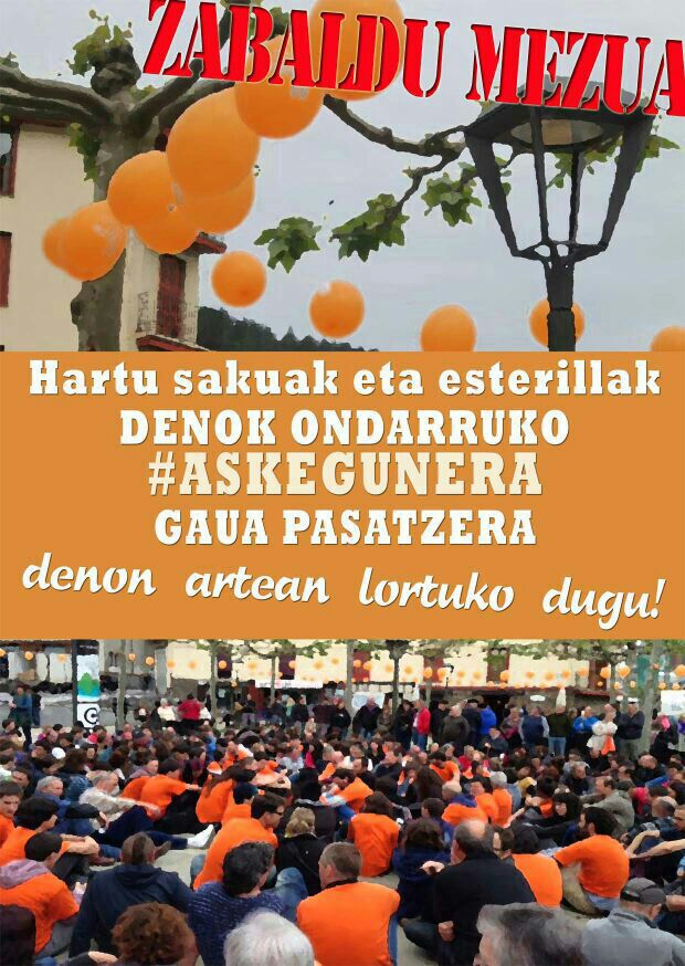 11:00 – Irabazi dugu. Urtza erun dabe, baine berak esaban morun, irabazi einddou. Argi laga dou zeintzuk gazen bakin alde, zeintzuk gabizen bide baketsuk erabiltzen. Eta argi laga dou zeintzuk dabizen Espainiko legin menpin. Espainiko Audientzixa nazionalak aginddu, PNVk bete eta ertzainak herritxarrak jo. Ondarruaz eta ondarrutarrakin harro egoteko egune da gaur. Eta eskerrik asko Euskal Herritxik etorri dan jente guztiai. Gora Urtza! Gora Euskal Herria askatuta! Danak etxea!