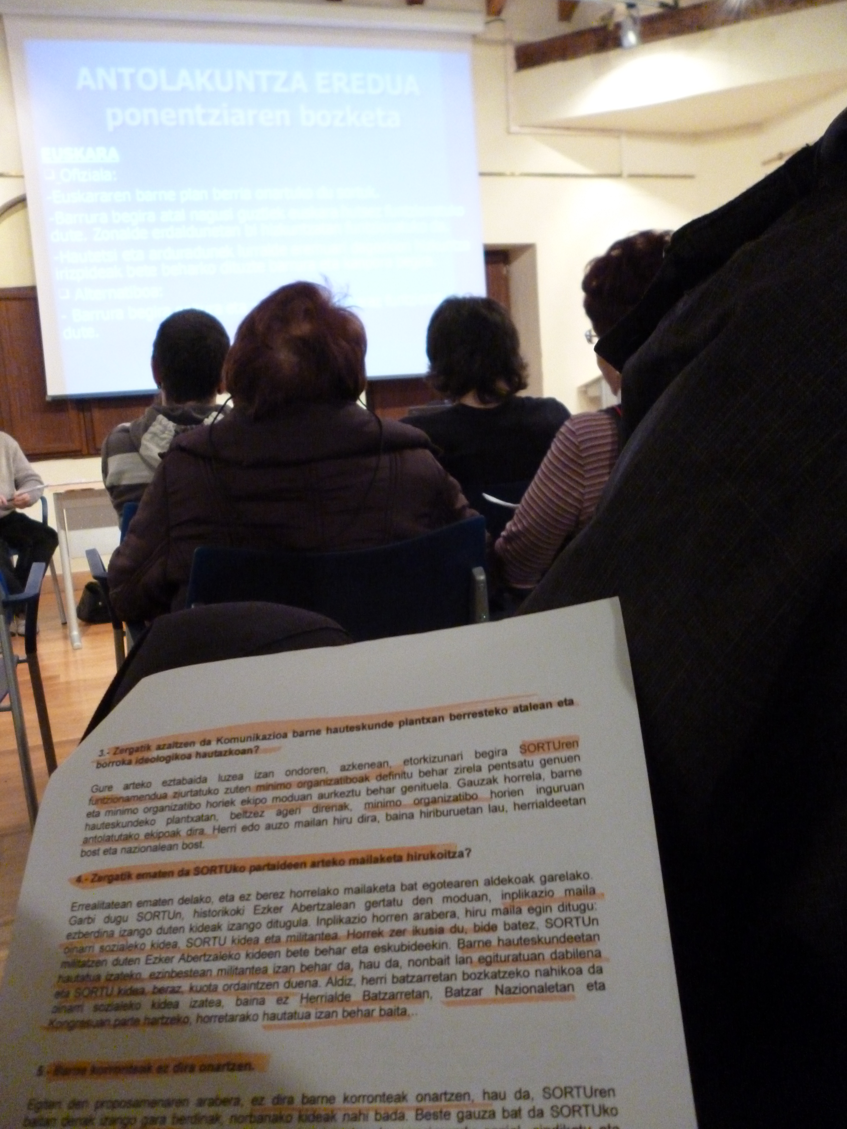 Aurreko zapatun, Sortzaile prozesun parte hartzen ari garen dozenaka lagunok SORTUk garatu beharreko komunikaziñoi ereduaz eztabaidatzeko batzarra ein gendun Andoainen. Araba, Bizkaia, Gipuzkoa eta Nafarroako herri ezberdinetako 80 lagun inguruk, komunikaziñoi politiku errotik berritzeko premiaz eztabaidatu zuten, eta norabide horretan Sortu-k burutu beharreko hausnarketa eta lanaz. TURRUNE bertan egon zan.